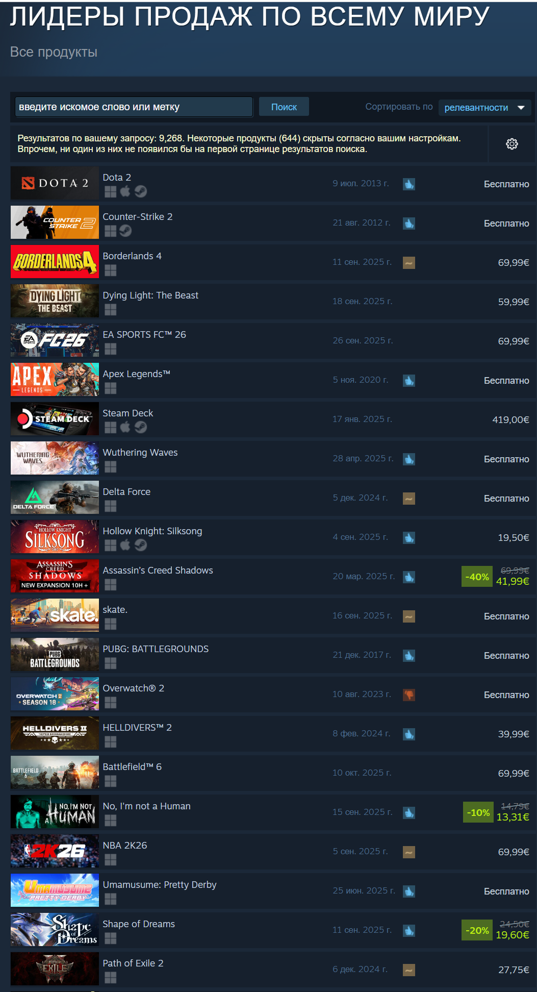 >>5581235 Не, у нее было то ли 8 то ли 9 место и то с учетом русского акка, где часть игр не показывалось. Тут если бы я со своего стим акка заходил(а я проверял) - было бы 4ое место, потому что не показывалось бы ни бордерлендса ни еще некоторых игр.