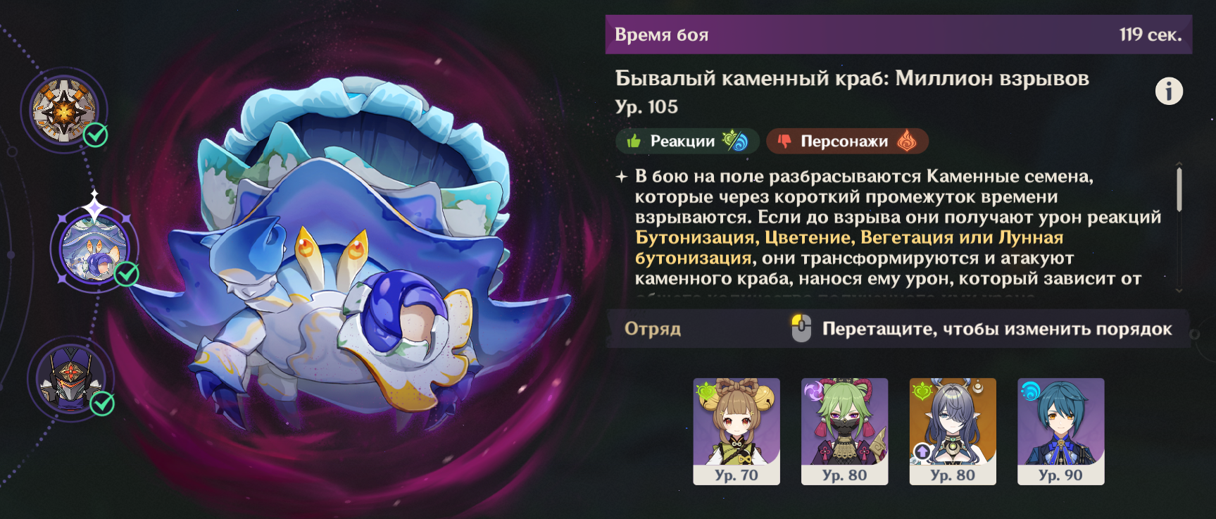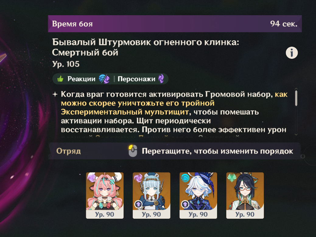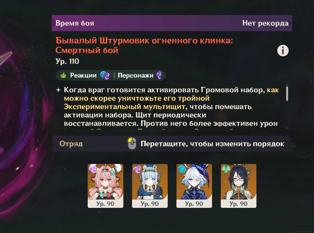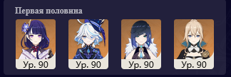 Короче закрыл первые 2 уровня 5го надриска. С крабом пришлось канеш потрахаться. Остался Фатуй и на нем чет не так уже и здорово все по ростеру. Есть: с3 Рейден, Сянкобенис, Сынидзе. Есть С0р1 Мявуйка с с2р1 Шилонен и с0р0 Цитлали. Есть с6 Фишля. Нужен какой-то способ накладывать много гидро, чтобы можно было делать электрочардждед реакцию и сбивать шилду. Но Фурина у меня ушла на первый уровень. Я так понимаю роботяном это все проходится катаясь по клаве. А если у меня ее нет?