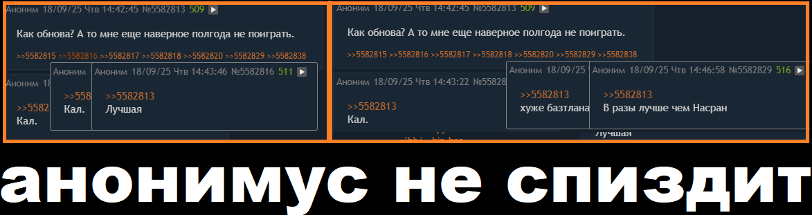 >>5581913 Не дропнул бы, мне не нужен тред, чтобы занюхивать опен и проходить квесты Тред - кусок говна, состоящий из набросов, срачей и обсуждения чьих-то фантазий, в том числе сексуальных, но не самой игры Ему бы вахтёра на 24\7, как пару раз бывало, но каждый раз стоит вой про "стерильность! общение душат!", хотя никакого общения тут никогда не было и нет