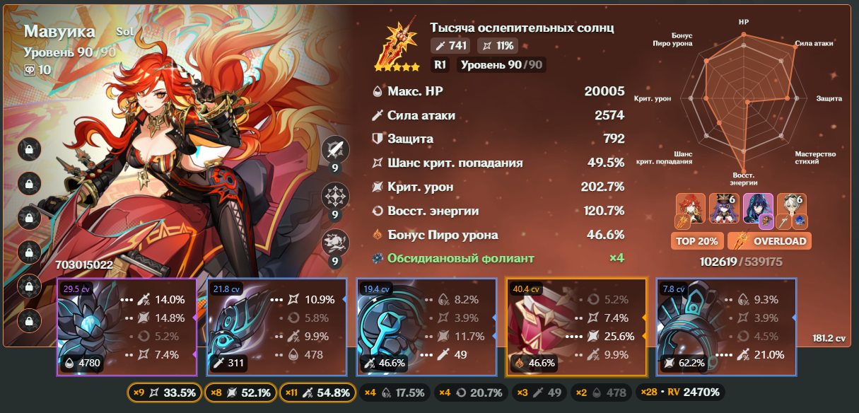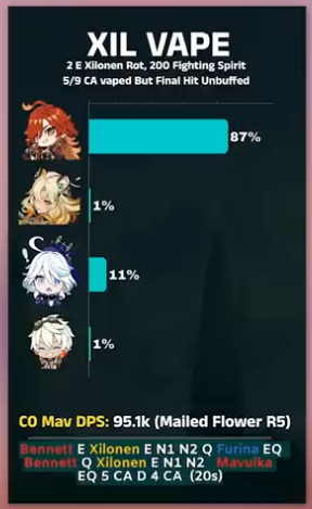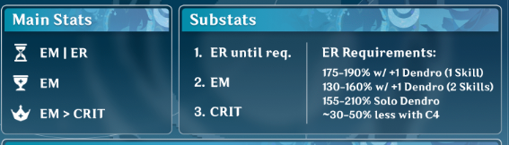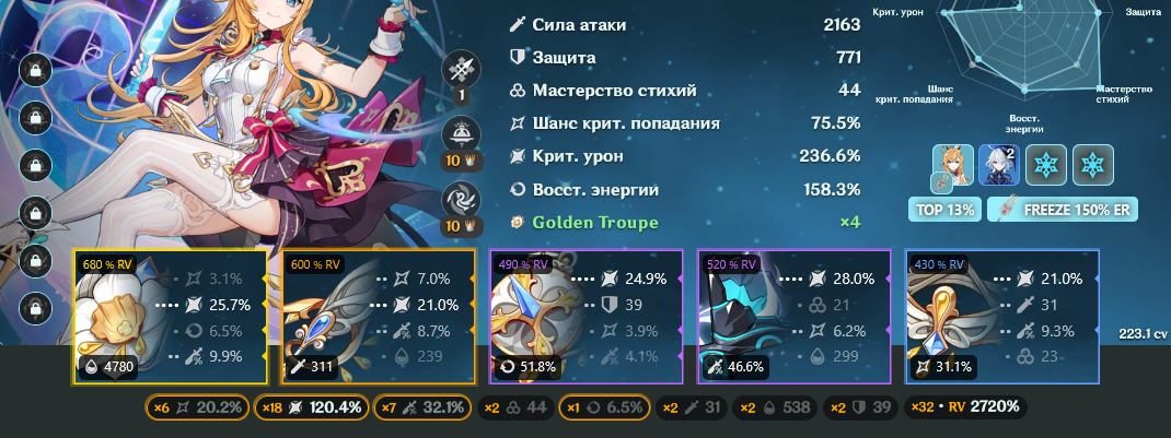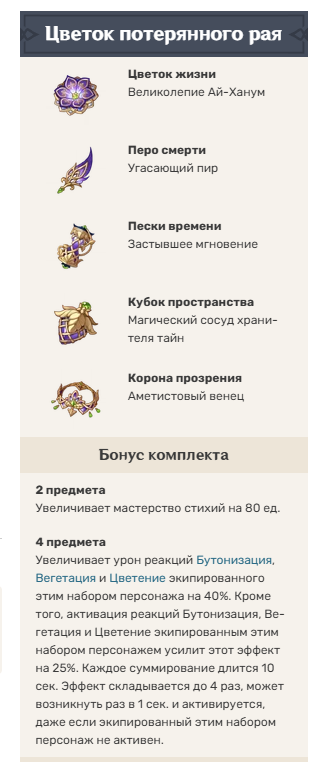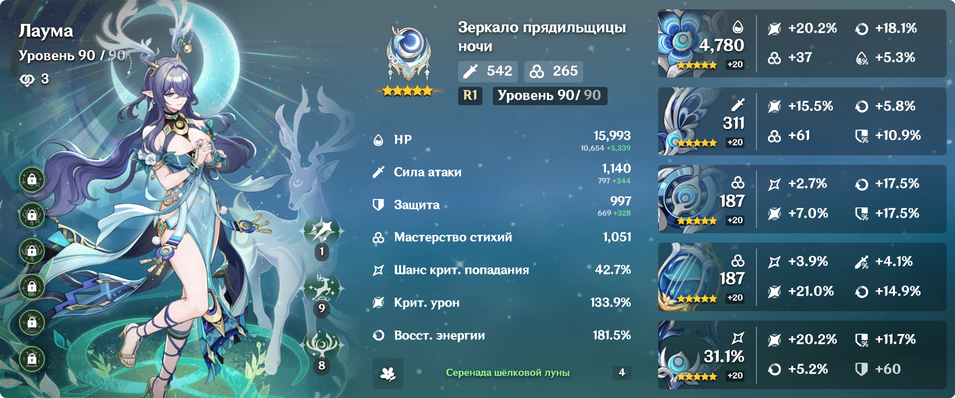 1к мс собрали, востановы под 180, остальное в атаку и криты. Бутоны критуют с шансом 15%, при 2 луне 30 есл не ошибаюсь и это еще складывается с 15% Нахиды с2. Шмот на криты бутонов не влияет, только на холд Е Лаумы.