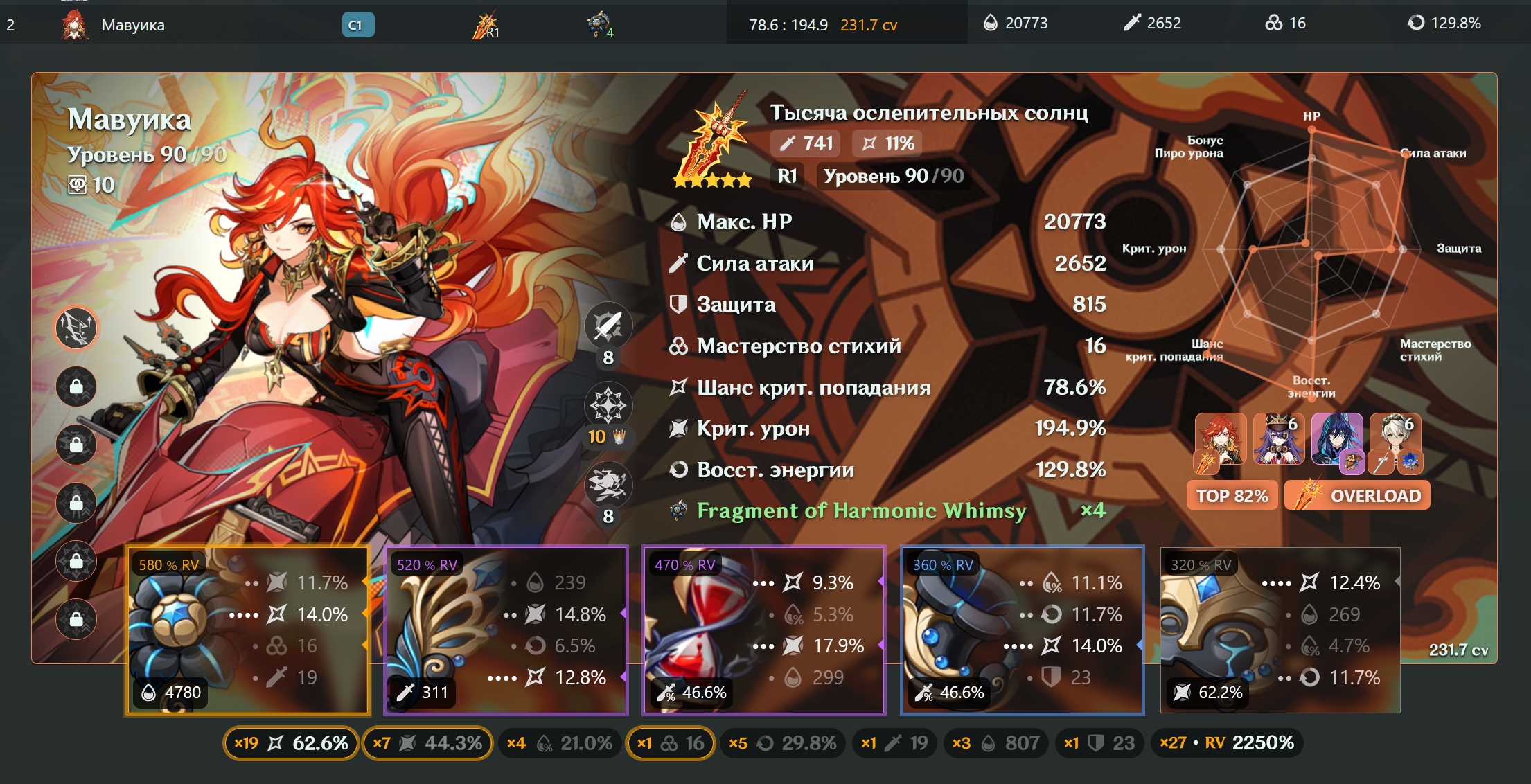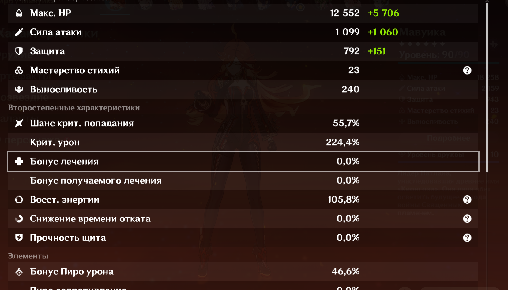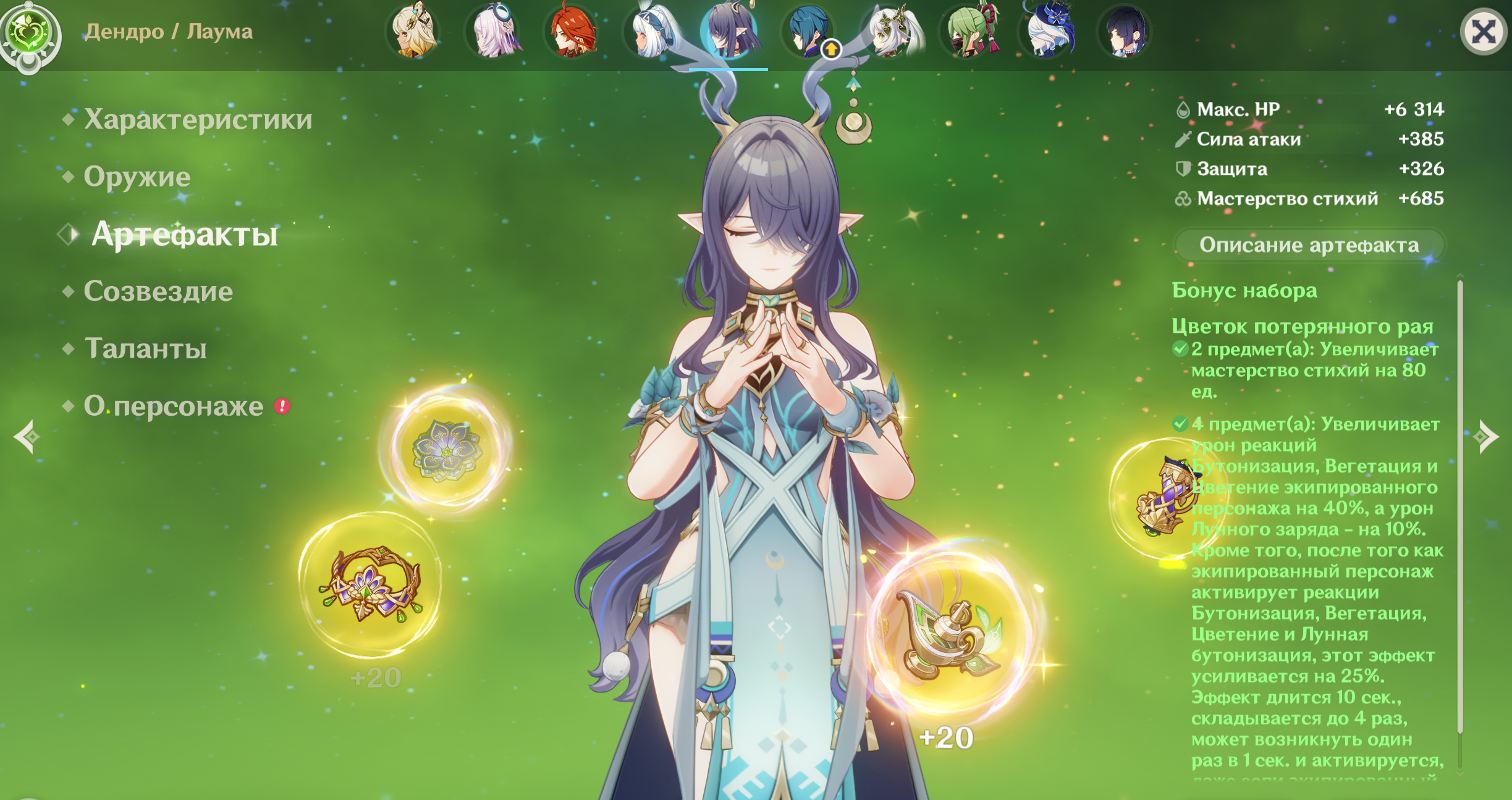 Пересобрал Куки в этот сет до этого бегала в дендро сетике на срез дендро, стало даже больше на 80МС по итогу у нее, нацепил на Лабубу дремучий лес собственно, чтоб он в пачке не терялся. Нахуярил ей фулл ЕМ и ЕР билд как везде советуют типа до этого было 800МС и 55/140 критов, ща 24/75 и 1050 МС без бафов.