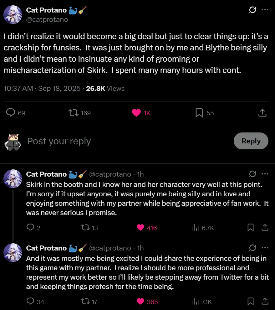 ВА Скирк постила у себя в твиттере арты со скирк и рериром (ее ебарь озвучивает рерира), после чего интелы засрали ей личку, теперь извиняется. Мнение?