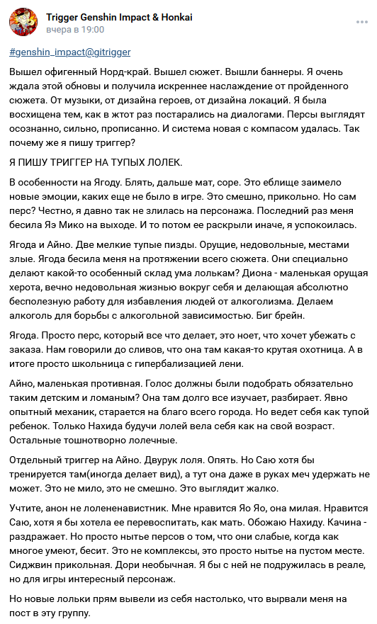 >>5587951 Ору с того что она считает реалистичным характер Нахиды соответствующий ее возрасту, но при этом характеры Ягоды и Айно считает слишком детскими или в случае Ягоды подростковыми. Небось сама писюха и ей ниприятно, что персонажи ее возраста не ведут себя как взрослые