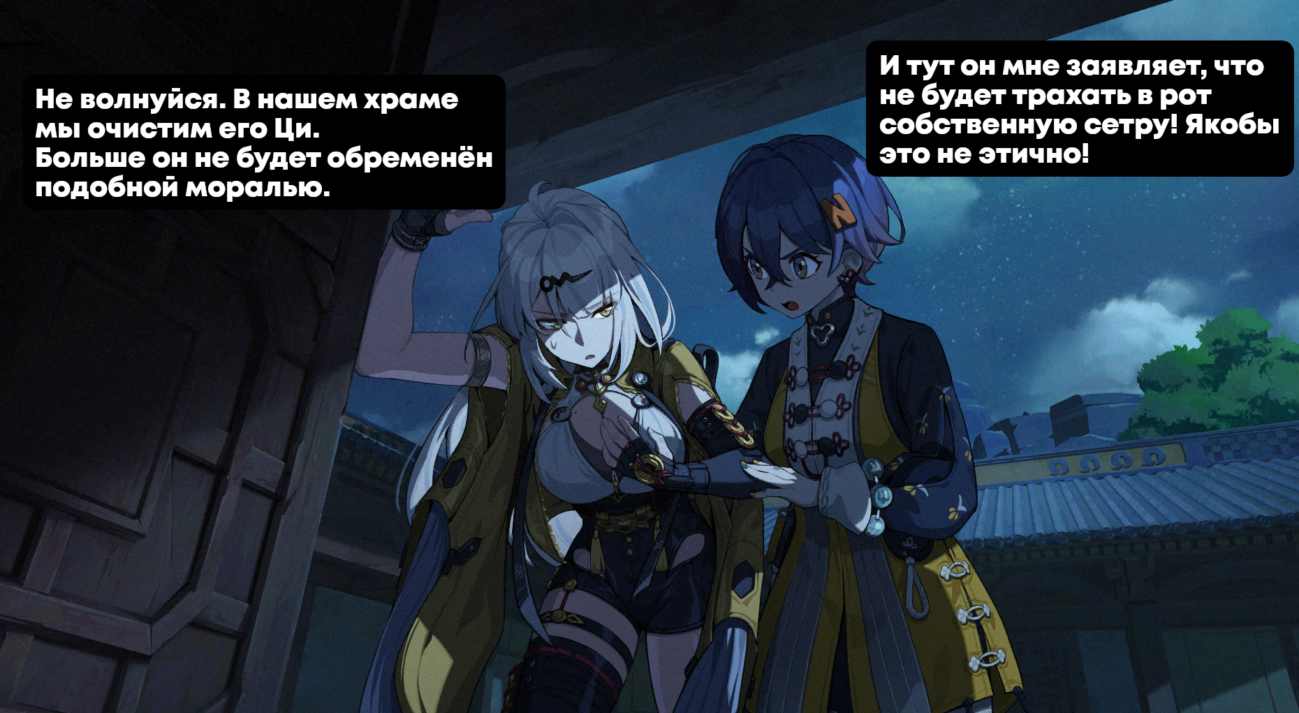>>5592556 «Для надоедливых мерзавцев у меня наготове не только крепкое словцо, но и пуля! Хочешь попробовать?!» «Капитан, давайте не будем делать импульсивных решений... Иначе завтра вы можете проснуться в розовой кобуре!» «Кхе...»