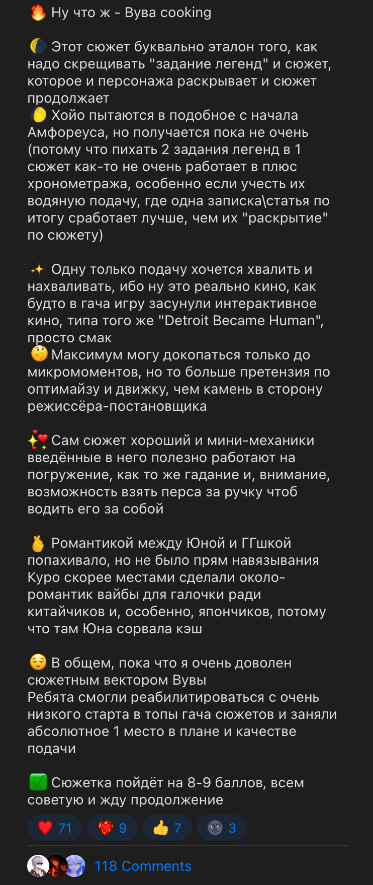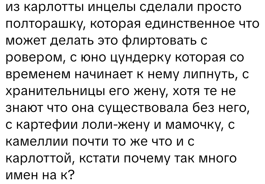 Сап, аноны, тут есть адекватные люди? КТО ВИДИТ проблему игры, а именно, хороший, но коридорный сюжет, вот, к примеру, выходит персонаж, появляется в сюжете, выходит обновление новое, персонаж сливается из сюжета и забыт! И так с каждым персонажем! Это как читать книгу, дочитать с первой главы до второй, и на второй главе остается главный герой, а персонажи до этого забываются. Вот, к примеру, Камелия, две кат-сцены в первом акте, один диалог, квест отличный, где её раскрывают как антигероя (если есть она на акке у тебя, получается, новичок вообще не будет понимать, кто она). Дальше слив, в то же время в ZZZ, на худой конец, в Genshin, персонажей не забывают, я не понимаю, почему они такую возможность упускают, это же повысит перепродажу реранов, или они сюжет пытаются разогнать из-за плохого старта, и в 3.0 эти дыры уже закроют, и старые персонажи тоже будут влиять на сюжет, иначе не игра, а симулятор круток под обложкой "живого" мира. Пишу тут потому что никто это не обсуждает, максимум пост на реддит сегодня был, что мол какого играть зная что, персонажа забудут.