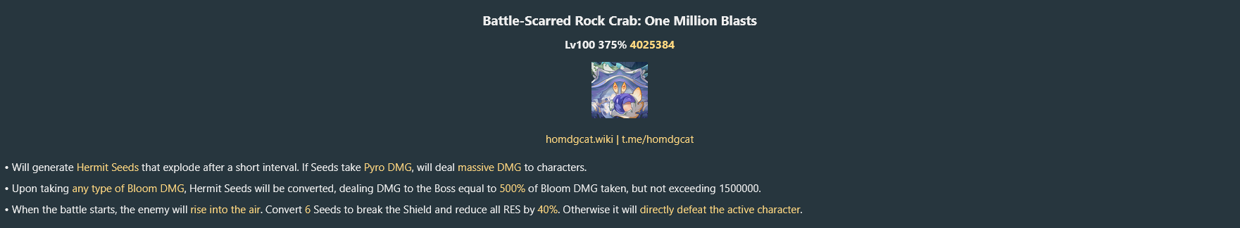 >Upon taking any type of Bloom DMG, Hermit Seeds will be converted, dealing DMG to the Boss equal to 500% of Bloom DMG taken, but not exceeding 1500000.