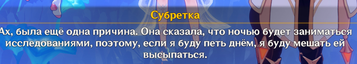 >>5598922 У неё своя форма аутизма, такое непонимание того, как люди меж собой взаимодействуют нормально, всё-таки лунная девочка, воспитанная кое-как фатуями. К тому же наконец-то вбрасывает сюжетные моменты, про фатуёв рассказывает, как там у них всё во дворце. И духов воспитывает.