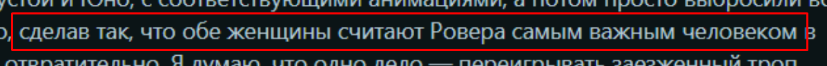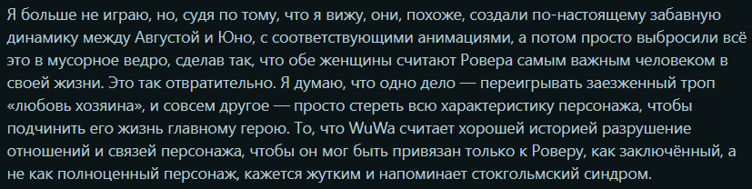 >Аватарка Морта >Вот би нам побольше шиппчиков, шоб интелов давануть Каждый раз вжушкаю с этих свидетелей релизного шиппчика Байжа X Морт. Люблю их потом закидывать войслайнами, где первая в итоге из ледышки рациональной начинает действовать как дурочка, что это вообще первый раз, когда она подобное испытывает в отношении другого человека (что после ее ПТСРа особенно забавно). А второй чисто жестко байтит на то, что нормально расслабиться и поговорить по душам за кофейком тет-а-тет он может только с Ровером и что это единственный человек, в котором он действительно нуждается и может вести себя по-настоящему (Байжу и Яо он в принципе рассматривается в лучшем случае как коллег).