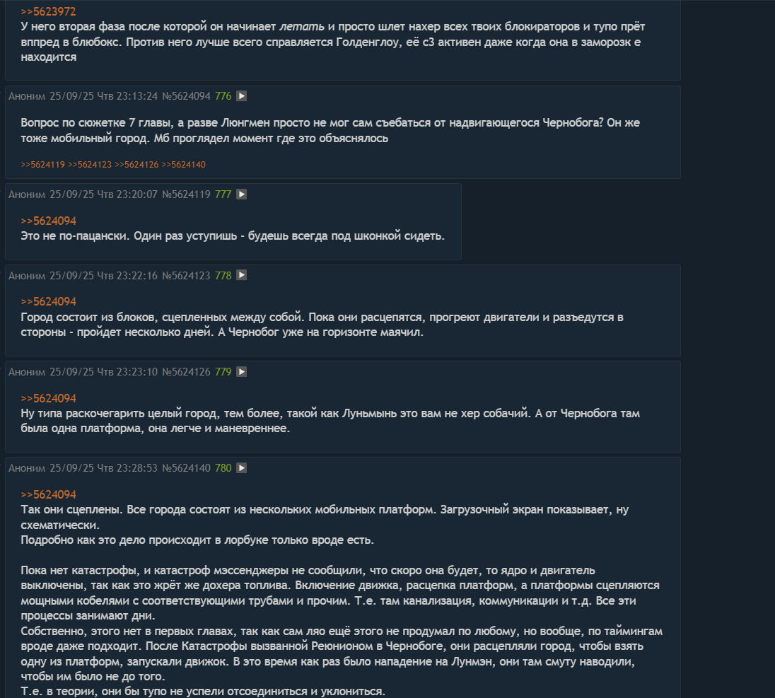 Вопрос по сюжетке 7 главы, а разве Люнгмен просто не мог сам съебаться от надвигающегося Чернобога? Он же тоже мобильный город. Мб проглядел момент где это объяснялось