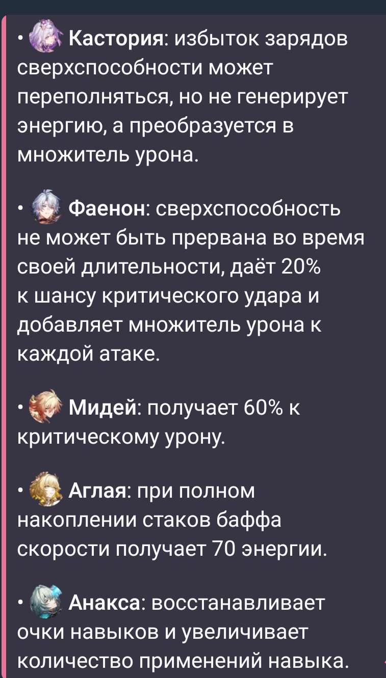 Castorice: Excess "NewBuds" can overflow but cannot generate energy. Converts overflow amount into damage multiplier. Phainon: Ultimate does not expire, grants 20% CRIT Rate, and adds a damage multiplier to each attack. Mydei: Gains 60% CRIT DMG upon first ascension to "Vendetta.” Aglaea: At full stacks, gains 70 Energy from Speed. Anaxa: Recovers Skill Points and increases the number of Skill segments.