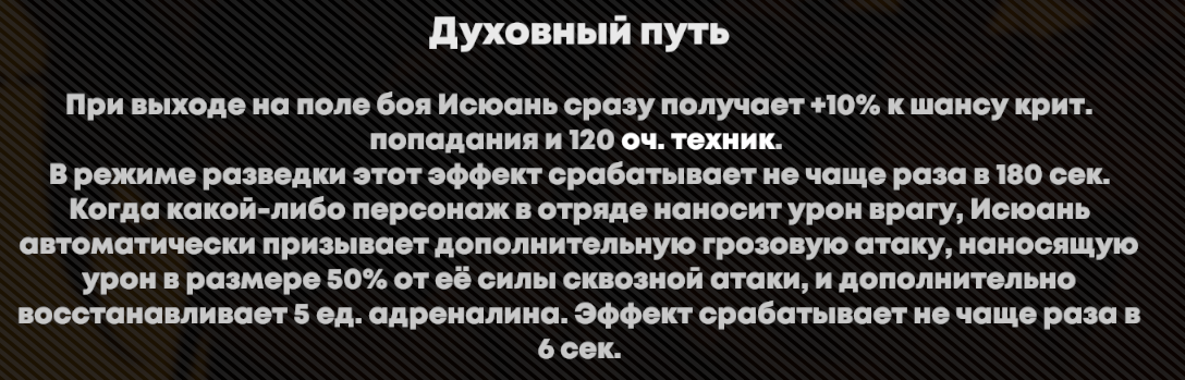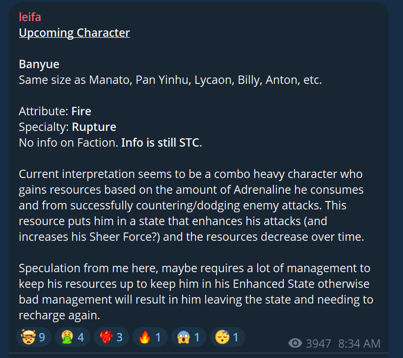 Текущая интерпретация такова, что это персонаж, ориентированный на комбо, который получает ресурсы в зависимости от количества потраченного Адреналина и от успешных контратак или уклонений от атак противника. Этот ресурс вводит его в состояние, которое усиливает его атаки (и, возможно, увеличивает его Абсолютную Силу?), при этом запас ресурсов со временем уменьшается.