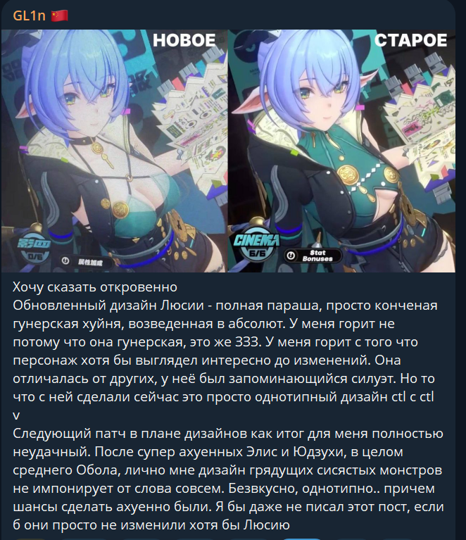 Хочу сказать откровенно Обновленный дизайн Люсии - полная параша, просто конченая гунерская хуйня, возведенная в абсолют. У меня горит не потому что она гунерская, это же ЗЗЗ. У меня горит с того что персонаж хотя бы выглядел интересно до изменений. Она отличалась от других, у неё был запоминающийся силуэт. Но то что с ней сделали сейчас это просто однотипный дизайн ctl c ctl v Следующий патч в плане дизайнов как итог для меня полностью неудачный. После супер ахуенных Элис и Юдзухи, в целом среднего Обола, лично мне дизайн грядущих сисястых монстров не импонирует от слова совсем. Безвкусно, однотипно.. причем шансы сделать ахуенно были. Я бы даже не писал этот пост, если б они просто не изменили хотя бы Люсию