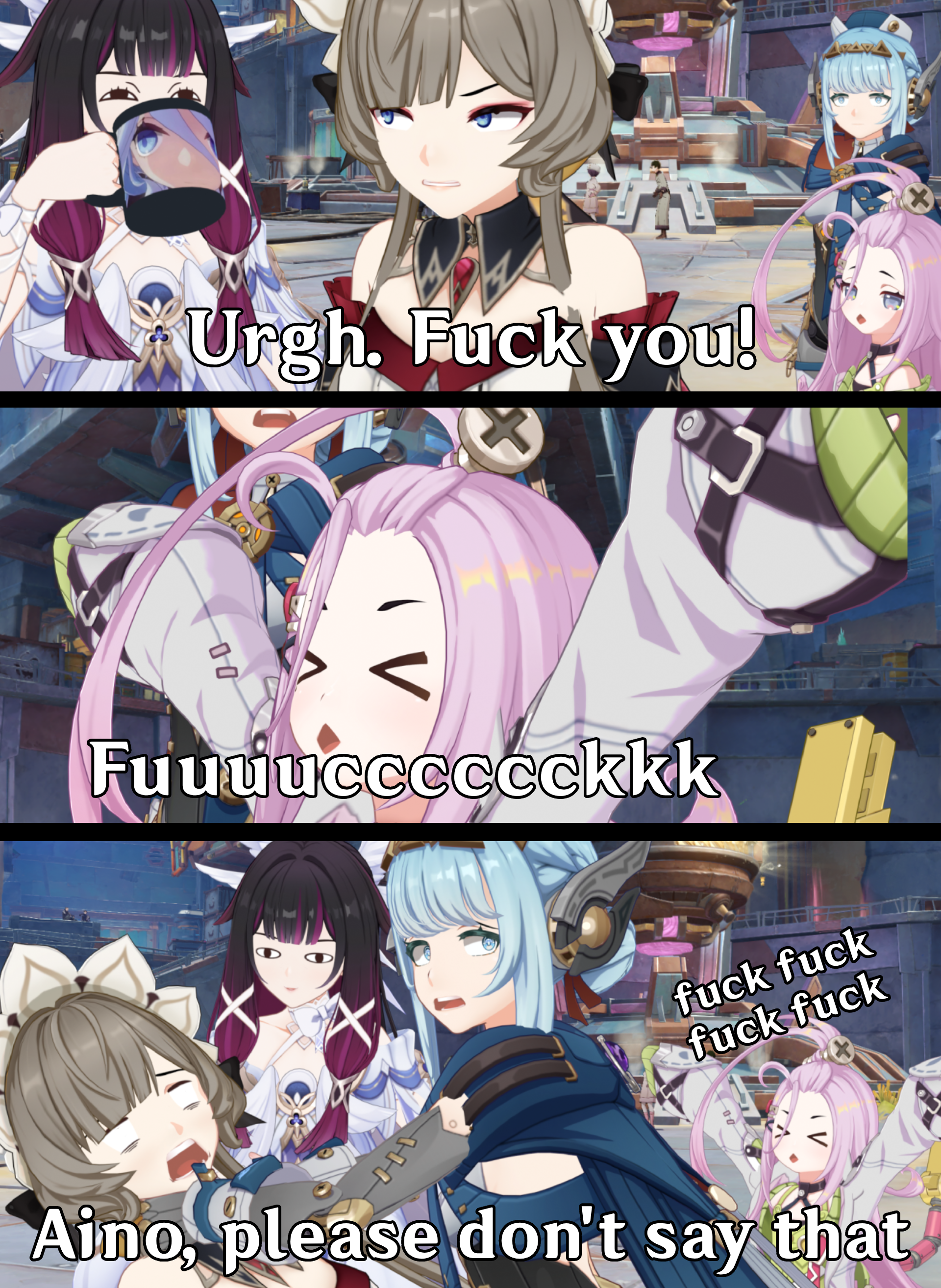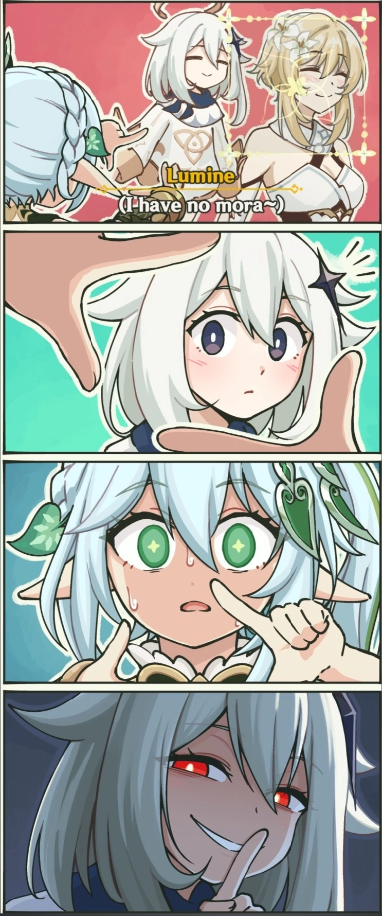 Прошёл эвент наконец. Неплохая история. С лунными падисарами зря, тупо время потратить. Инефа лучшая мама, не зря выкрутил, чуйка хороша сыграла. Айно супер няха, вместе с мелюзиной офк. Дори опять под наркотой, как актриса не устала?
