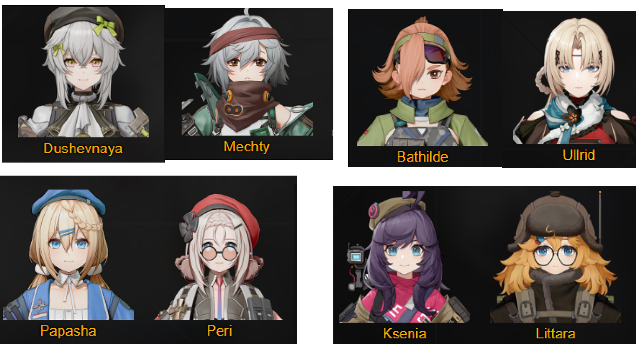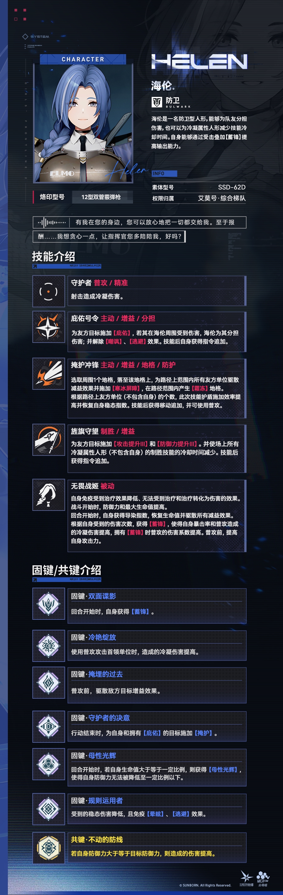Хелен . Мороз. Класс Бульварк, использует дробовик ДП-12. Обычные атаки наносят морозный урон. Пассивка: Увеличивает максимальное ХП и защиту, снимает дебаффы с себя и восстанавливает определённое количество хп. Чем больше дамага Хелен впитывает, тем больше бафов она для себя получает. Ульта: Выбирает 1 союзника и увеличивает его атаку и защиту, а также понижает кулдаун ультимейта у кукол с морозным элементом. После использования этой способности, хелен получает доп. действие [Extra Command]. 2 скилл: Предоставляет союзникам щит. Производит морозный клетки и диспелит дебафы с союзников. После использования этой способности, Хелен может совершить дополнительную атаку. 1 скилл: Конвертирует дамаг впитанный союзниками в доп.действия [Extra Command](?) Её сигна: Увеличивает защиту и дамаг с обычных атак.