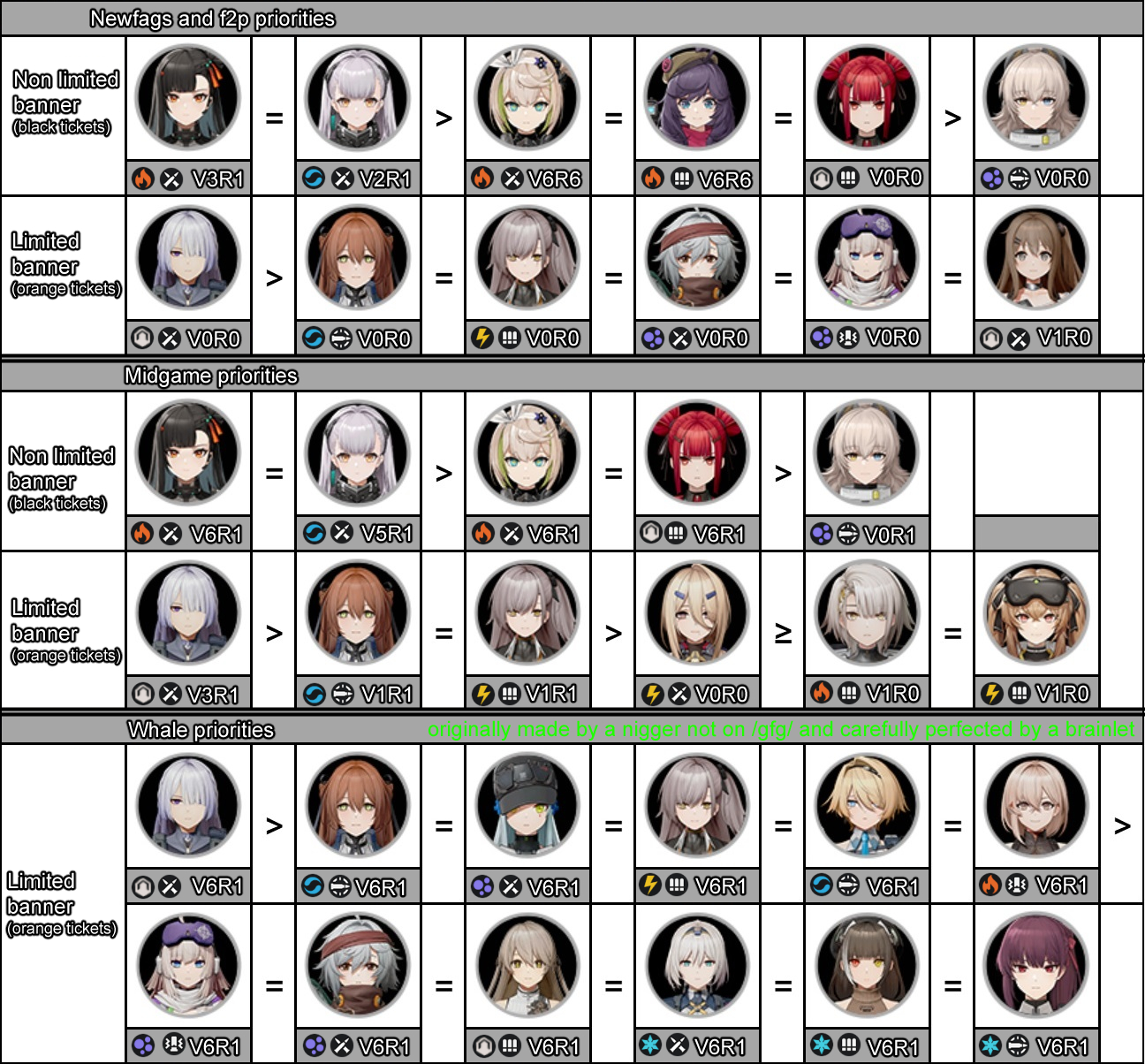>>5638618 Качай всех золотых кукол кроме кошки, пока что. Кошка без Клюкай не работает. Можешь у друзей или у платуна одолжить Клюкай и посмотреть как они вместе работают, но без этой синергии Кошка это бесполезный кусок. Из фиолетовых: Наган, Литтара, Гроза, Кролик это мусор, который давно пора в утиль. Колфне, Читу и Ксюху советую апнуть до 40 максимум, потом уровни много ресурсов требуют и эти куклы-саппорты дальнейших вложений не стоят. Немесис нужна исключительно, чтобы накладывать дебафф на защиту. Против боссов выше тебя уровнем может иногда помогать. Шаркри — лучшая фиолка, на которой держится вся пиро пачка. Качать + одевать.