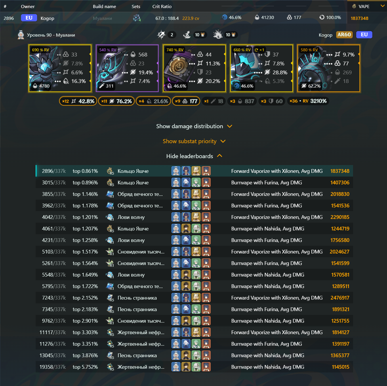 >>5617220 Это работало бы, будь разные сабстаты одинаково полезны. Но для акулы криты важнее хп%. А так получается, что у меня 34к хп 60/250 акула со 140мс, но она в разы хуже в рейтинге, чем >>5617124 просто потому, что у меня шапка на 250RV, а все полезные статы набраны другими артами. Какая-то странная логика.