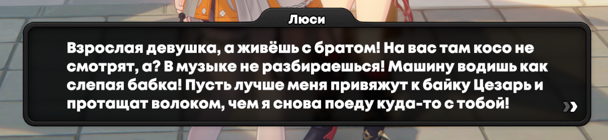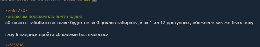 >>5620940 >Смехуечки уровня "писюха стесняется своего хвоста и пищит" - это не юмор. покажи пример хорошего юмора тогда, он же в з весь такой, то про булочки бобовые, то про жор сокаку, то про бёрнис с энергосами, твоим манером всё можно к хуйне свести >потому игра и скатилась в кал но выделил ты почему то не самый хуевый обол по Богинивости >Брендированные армейские чулки уже натянул? причем тут чулки, у всего обола в принципе на базовом уровне дизайны одни из самых комплексных, тупо сложнее трига с маской и дулом, потом сид с роботом и орфея с хвостом, плюс они не побрякушки у них, всегда взаимодействие совместное в геймплее и сценарии, та же орфи как акула и идхари с хвостом, но у них в анимациях хвосты чисто украшения ты вообще акцентируешь на хуйне, чтоб себе доказать почему те обол не нравится так бывает, когда вкуса нет, можешь дальше манькать