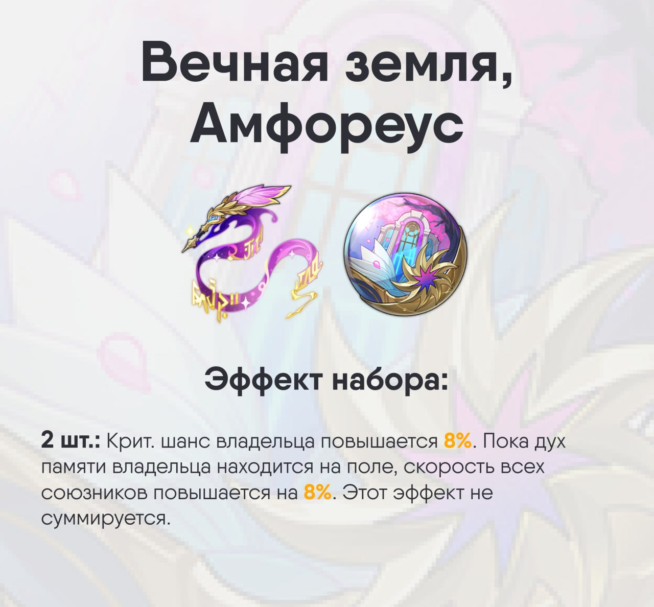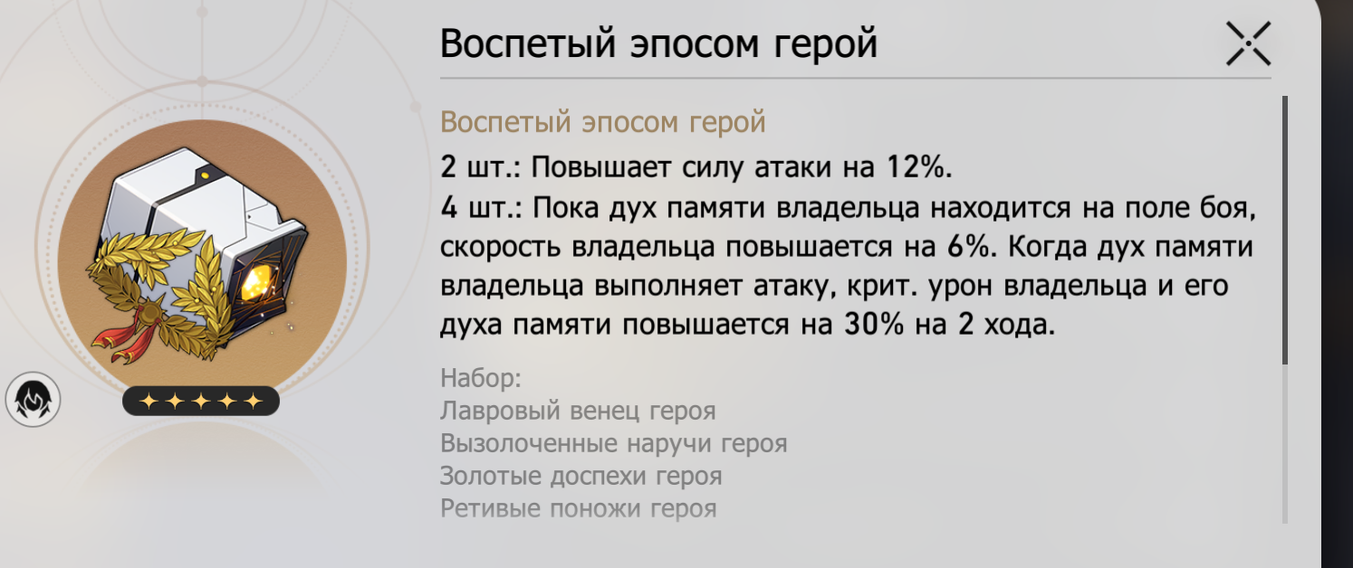 Повышает скорость владельца на 18% (30%). Когда дух Памяти владельца применяет Навык духа Памяти к союзнику, владелец получает эффект "Пустота", который повышает получаемый всеми врагами урон на 10% (18%). Когда дух Памяти владельца применяет Навык духа Памяти к врагу, владелец получает эффект "Стих", который повышает крит. урон всех союзников на 16% (28%). Когда дух Памяти владельца обладает одновременно эффектами "Пустота" и "Стих", их эффективность увеличивается на 100% (120%).