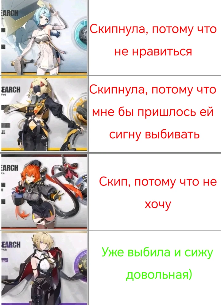 Вот этих не советую. Орфи тоже под вопросом. Многие почему-то говорят что отлично играет со всеми дамагерами, но чую что это тоже полная хуета. В нормальной пачке для нее тупо нет места, а если и впихнуть то не так эффективно как условная Астра/Юшка или еще какой-то саппорт/станер/аномалист. Поэтому играет только с Сидами, Бургерами.