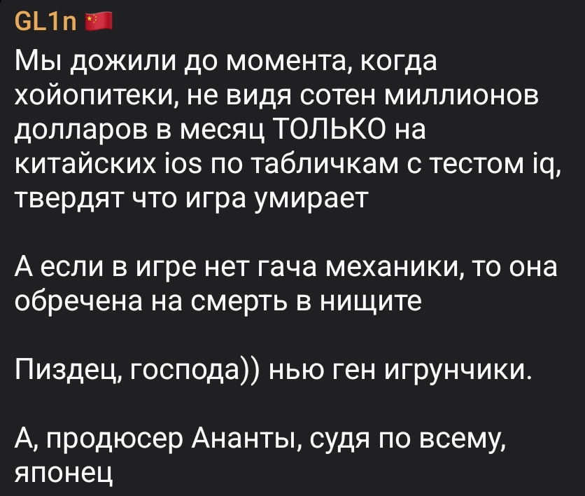 Мы дожили до момента, когда хойопитеки, не видя сотен миллионов долларов в месяц ТОЛЬКО на китайских ios по табличкам с тестом iq, твердят что игра умирает