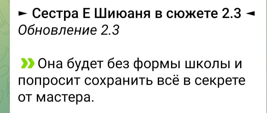 [ZZZ 2.3 Beta] (Спойлер) В сюжетной линии версии 2.3 мы встретим старшую сестру-наставницу Е Шуньгуан в одежде, отличной от её обычной формы, и она попросит нас держать это в секрете от мастера.
