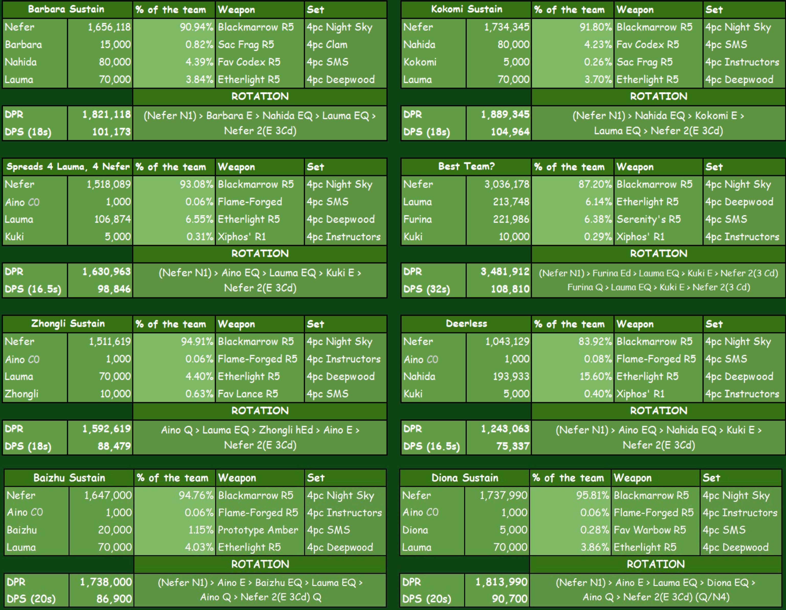 Изменений почти не было. Нефер чуть-чуть понерфили первую пассивку и пропорционально С2 (на 2% за стак). Реворкнули вторую пассивку и сделали её полезной. Немного дополнили управление чардж атаками, теперь можно просто зажимать кнопку (как у Аято или Итто). Якобы что-то поменяли у нового босса, но я пока не обнаружил разницы.