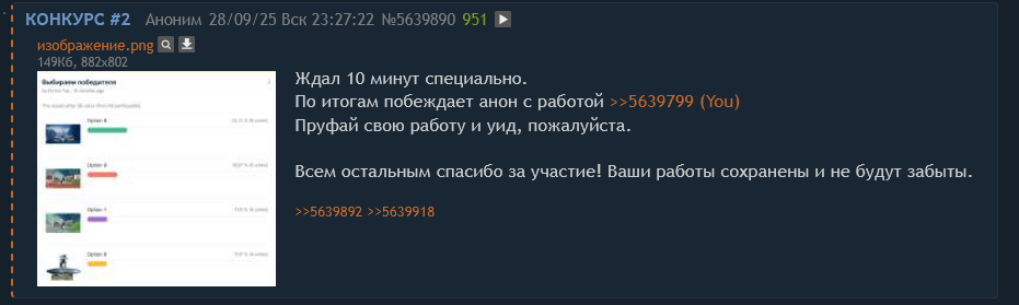 >>5639600 Ничего страшного, кто хочет - тот участвует, кто не хочет может спокойно проигнорировать. У меня не настолько крупные призы, чтобы из конкурса делать какую-то постановку. Мне просто хочется устроить немного движухи итт.