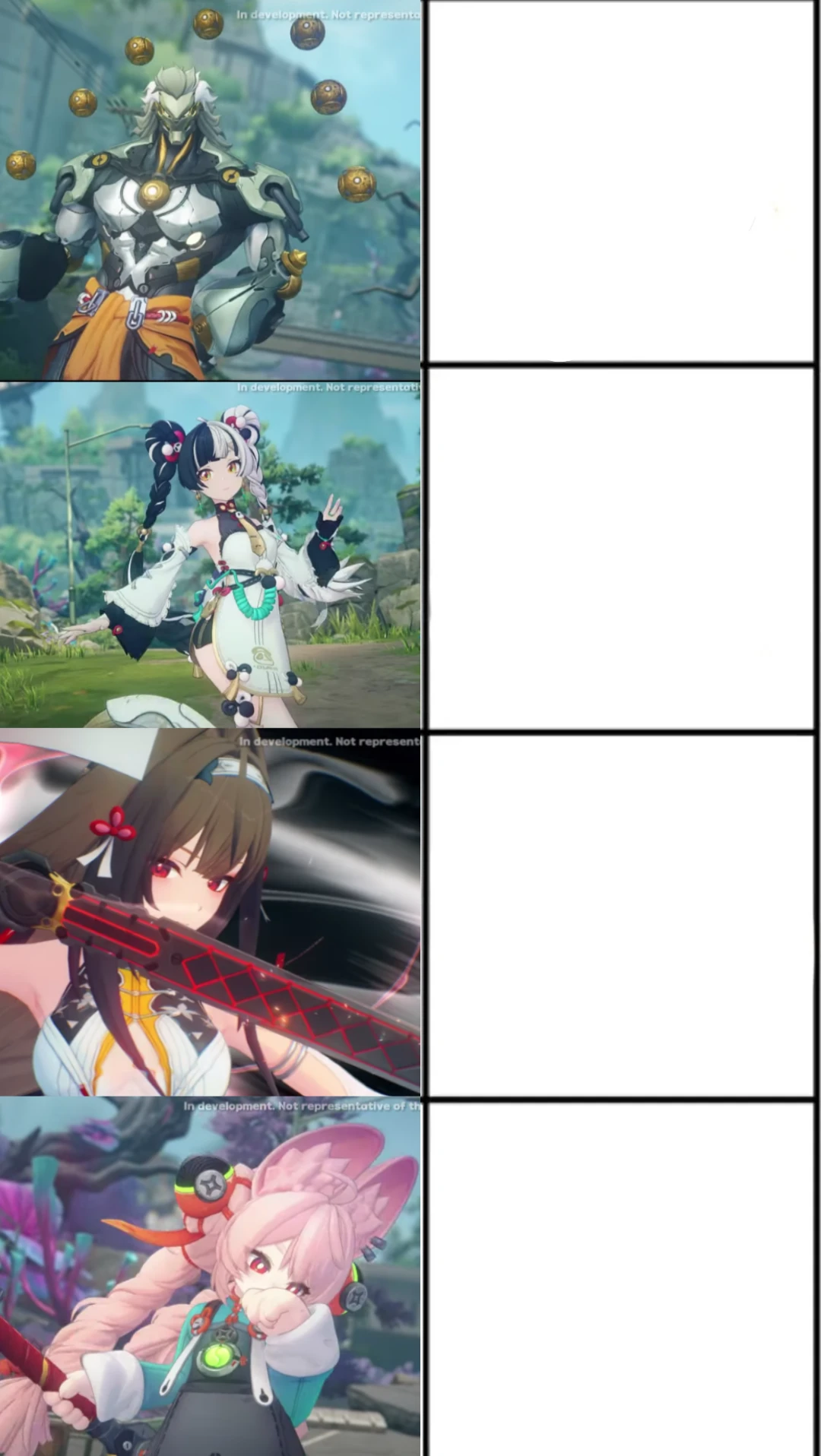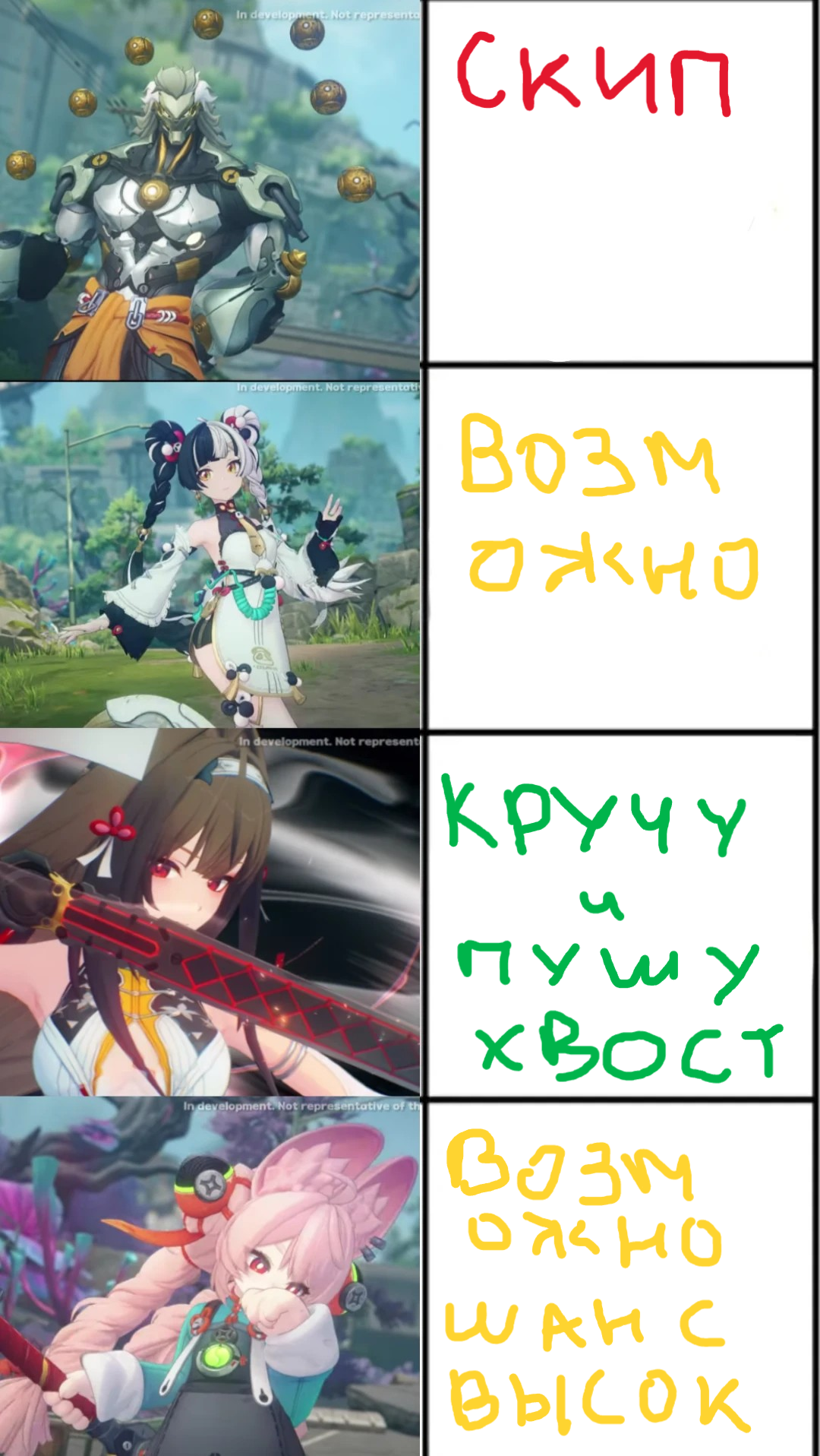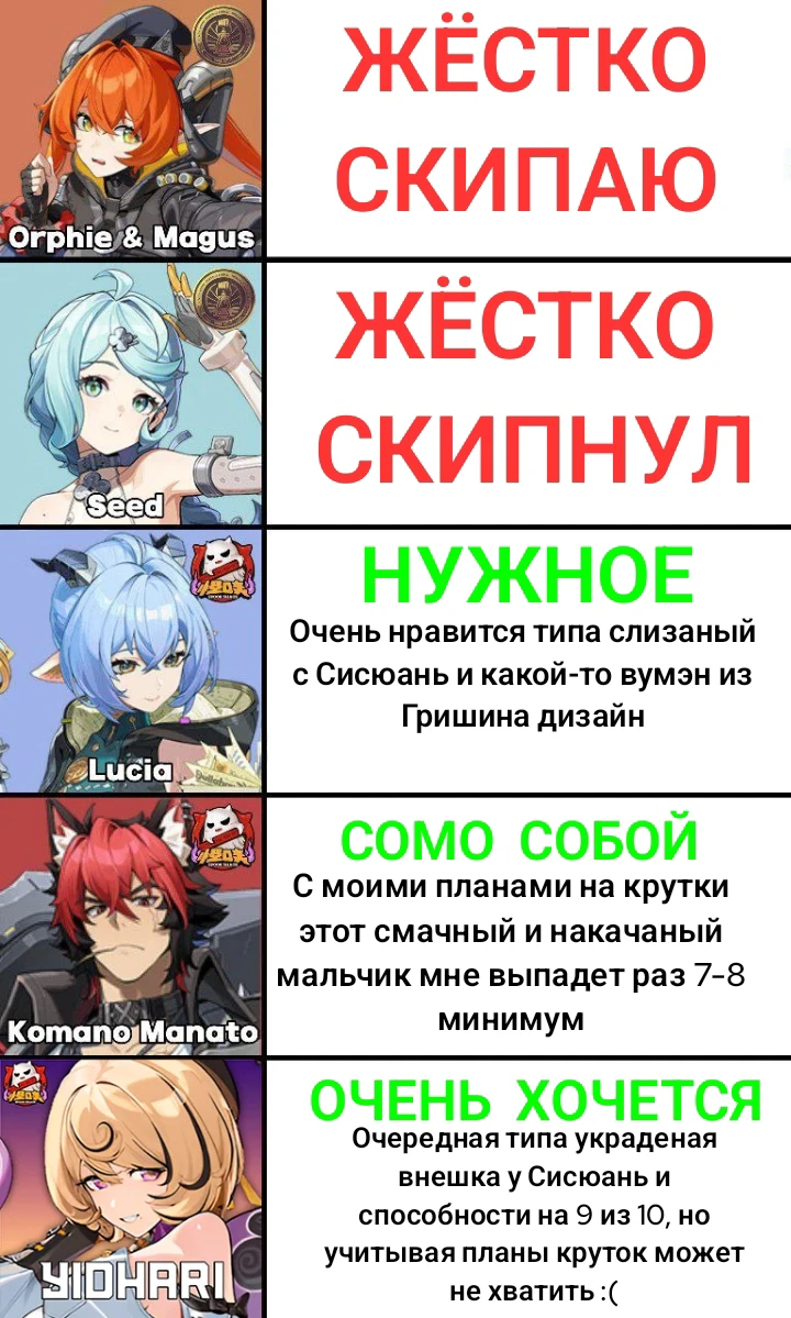 5. Хочется что бы уделялось внимание старым персонажам, стандартным персонажам S-ранга и A-ранга. Я хотел бы, что бы они получали геимплейные обновления, в связи с тем что боевая система и сложность в игре постепенно прогрессирует.