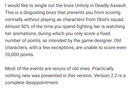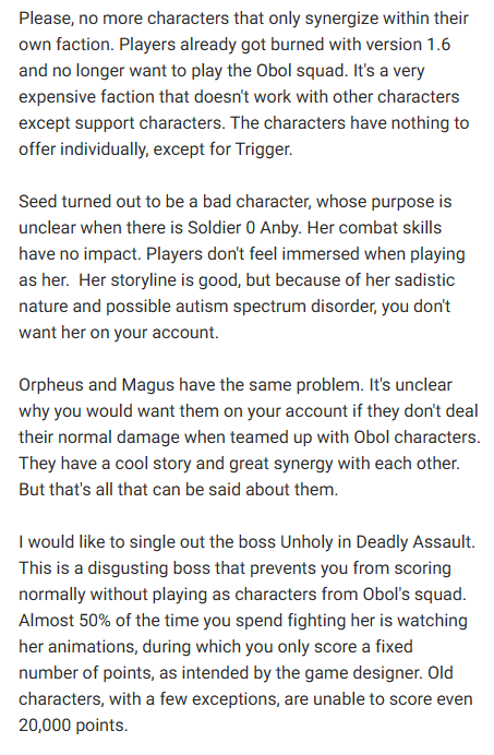 >>5650581 > 2. Механика пассивных навыков агентов, которые требуют наличия в команде персонажей фракции/класса/атрибута и так далее. Оно очень сильно ограничивает сбор команд, делая игру менее разнообразной. Лучше всего было бы убрать её полностью. Это очень поощерило бы экперементы с командами и разнообразило бы геимплей.
