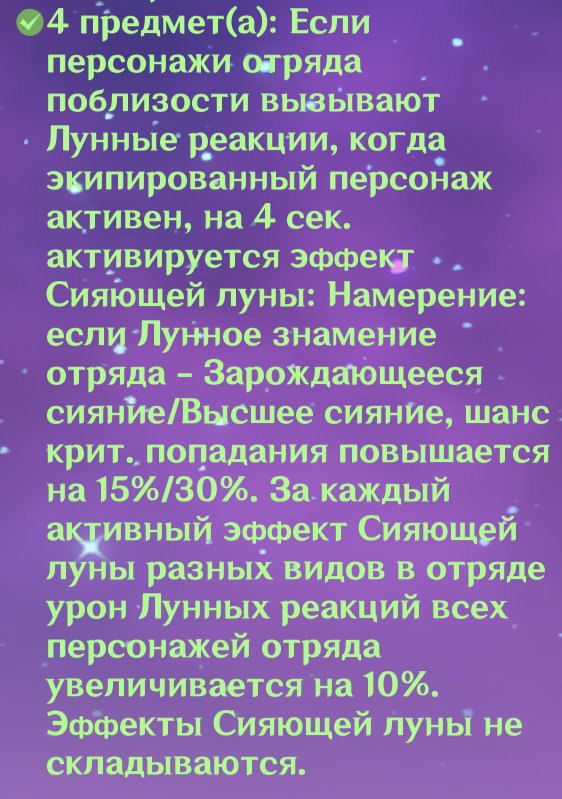 На 15 секунд после использования ульты все персонажи отряда получают 15% бонус урона реакций Заряжен, Лунный заряд, Бутонизация, Лунная бутонизация. Со вторым персонажем из Нод-Края бонус будет 35%.