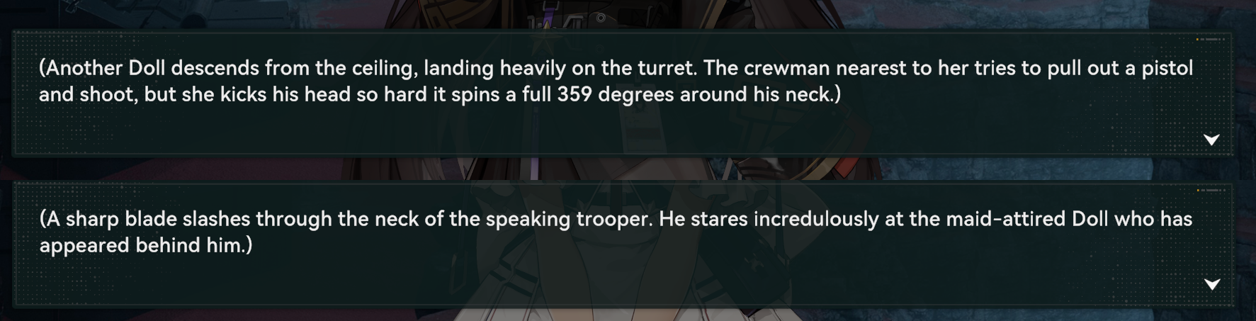 По итогу всего этого, ГФЛ2 лучшая: - тут отличный сюжет и неплохие диалоги. Тут адекватно прописанный ГГ который ведет себя как нормальный человек с ПТСР. - тут неплохие рейты и гаранты. - тут нормально сыпят ресурсов. - тут почти нет блоков прогрессии.