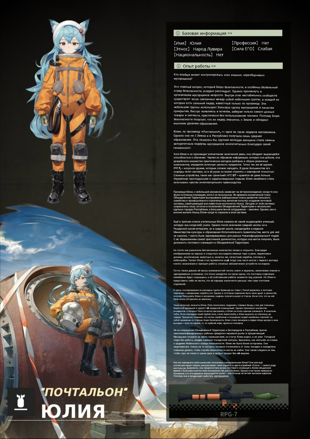 >>5662676 Она — револьвер Наган, очень старая бабушка-робот. Что в первой части, что во второй, её функция была быть одной из первых кукол в твоём распоряжении. Ты её получаешь, начинаешь играть, понимаешь насколько она бесполезная в сравнении с высокозвёздочными девочками и сдаёшь её в утиль ради ресов бережно оставляешь её собирать пыль в спальне.