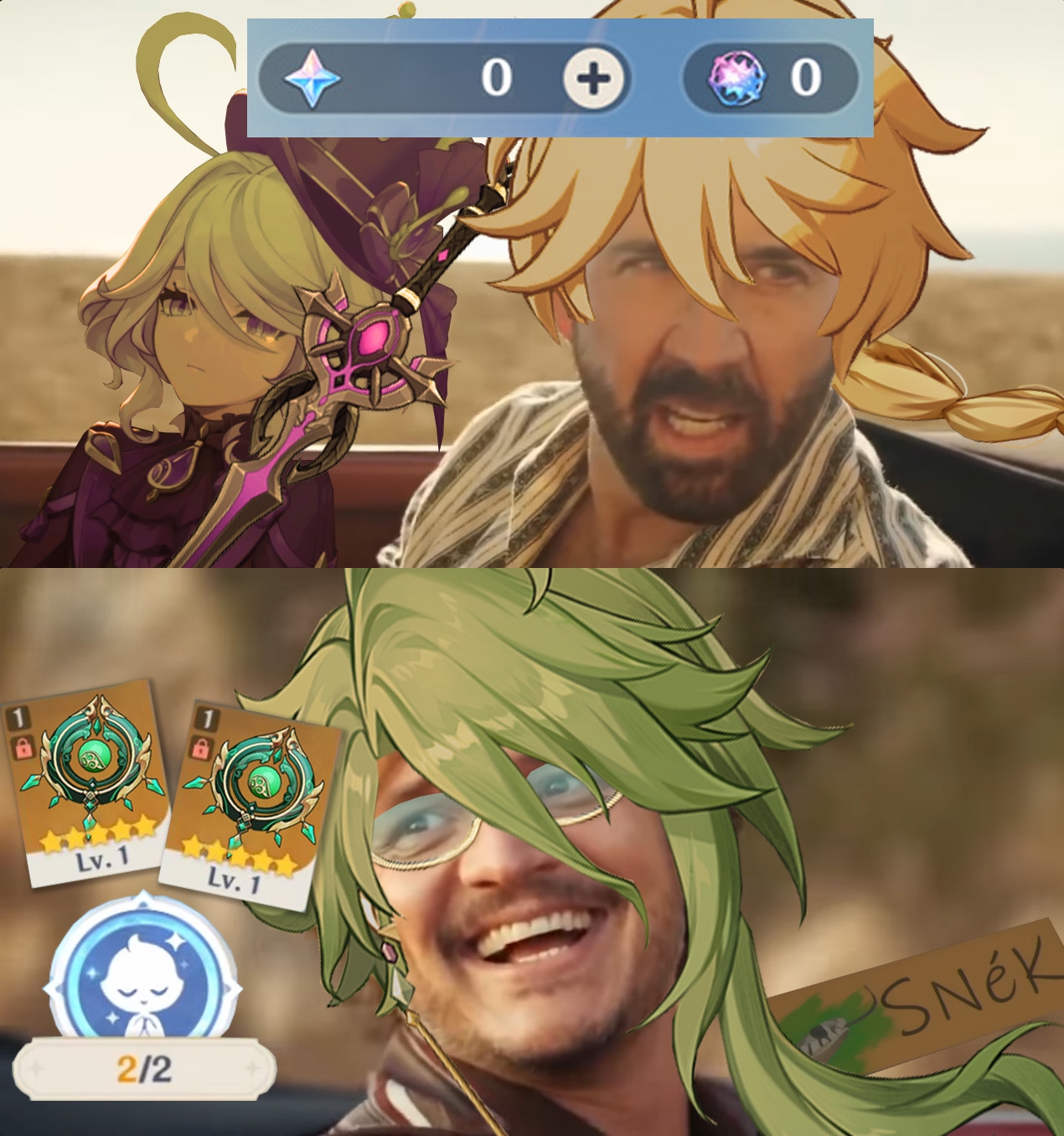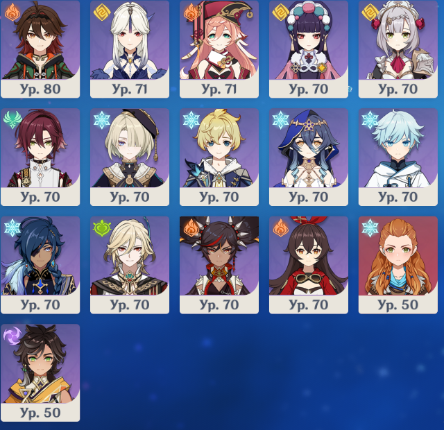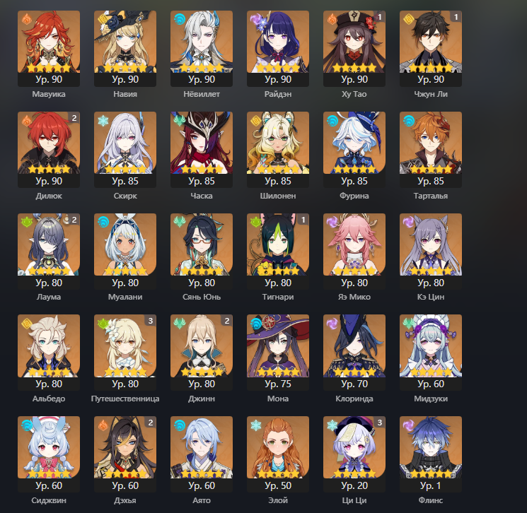 У меня ресурсов нет, мне ещё качать Муалани, Флинса, Лауму, Лань Янь и Нефер в ближайшее время. И арты нужны. И оружку качать для Жопича (алтас) и сигну для Нахиды.