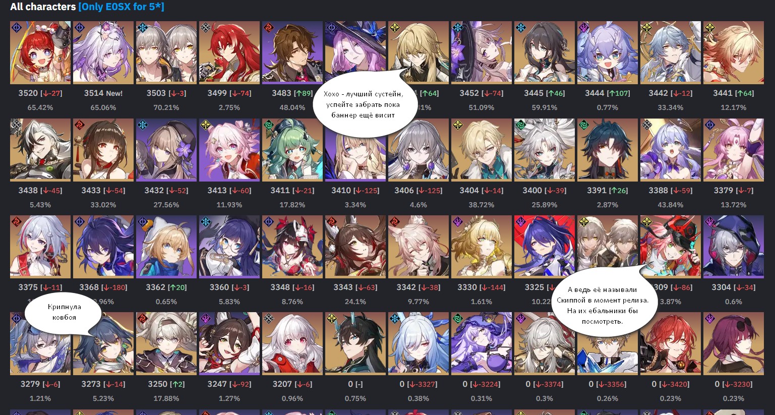 Да и в целом у нас будто сформировавшаяся мета патчей. х.0 - абсолютно всегда лютый скам и наеб гоев (исключением может служить только зеля, но там был релиз игры, сами понимаете) х.1 - Какой-то сильный саппорт на ближайший год х.2 - аниверсари, мейшпуш и все крутки сюда. Все дырки балансятся под этого чарика (на релизе вместо нее была зеля, там календарь съехавше-урезанный из-за первого года, как всегда) х.3-х.4 - второй пуш и всякая отбраковка х.5-х.6 - филлеры и говняк забивать год. Средние балансные чарики, тут можно все скипать - ничего не потеряешь х.7 - Какой-то гнилой сап на старую мету с целью заскамить перед новой планетой - Фуга, Саня, Кирена По этой же причине всем настойчиво советую скипать Калстанцию. А еще есть жучка как исключение из этой меты патчей, но как мы видим первый год в целом был особенный