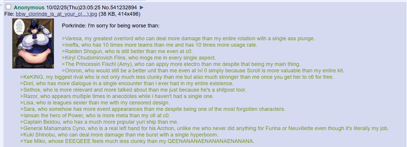 Кстати возможно у ляо реально есть план. Сейчас кихрюн это чисто стратегическая единица, он не особо сильный, но он сосиска и просто сделан для того чтобы высосать у паймон накопленные после насрана крутки. От него сейчас не стоит ожидать большой заработок. И по идее ляо сейчас должен завалить сис хусбами, чтобы они не посмели уйти в засол снова, и вынудит их задонатить. Пока всё идет по плану.