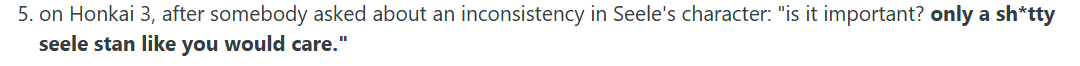 on Honkai 3, after somebody asked about an inconsistency in Seele's character: "is it important? only a sh*tty seele stan like you would care."