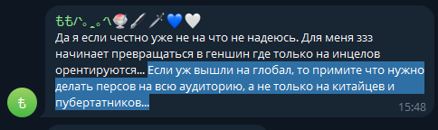 Всем похуй, основная масса ненавистников теликов ливнуло ещё на старте и продолжила чистить "интересный" контент (типа, попена в гашне) в других гача-играх.