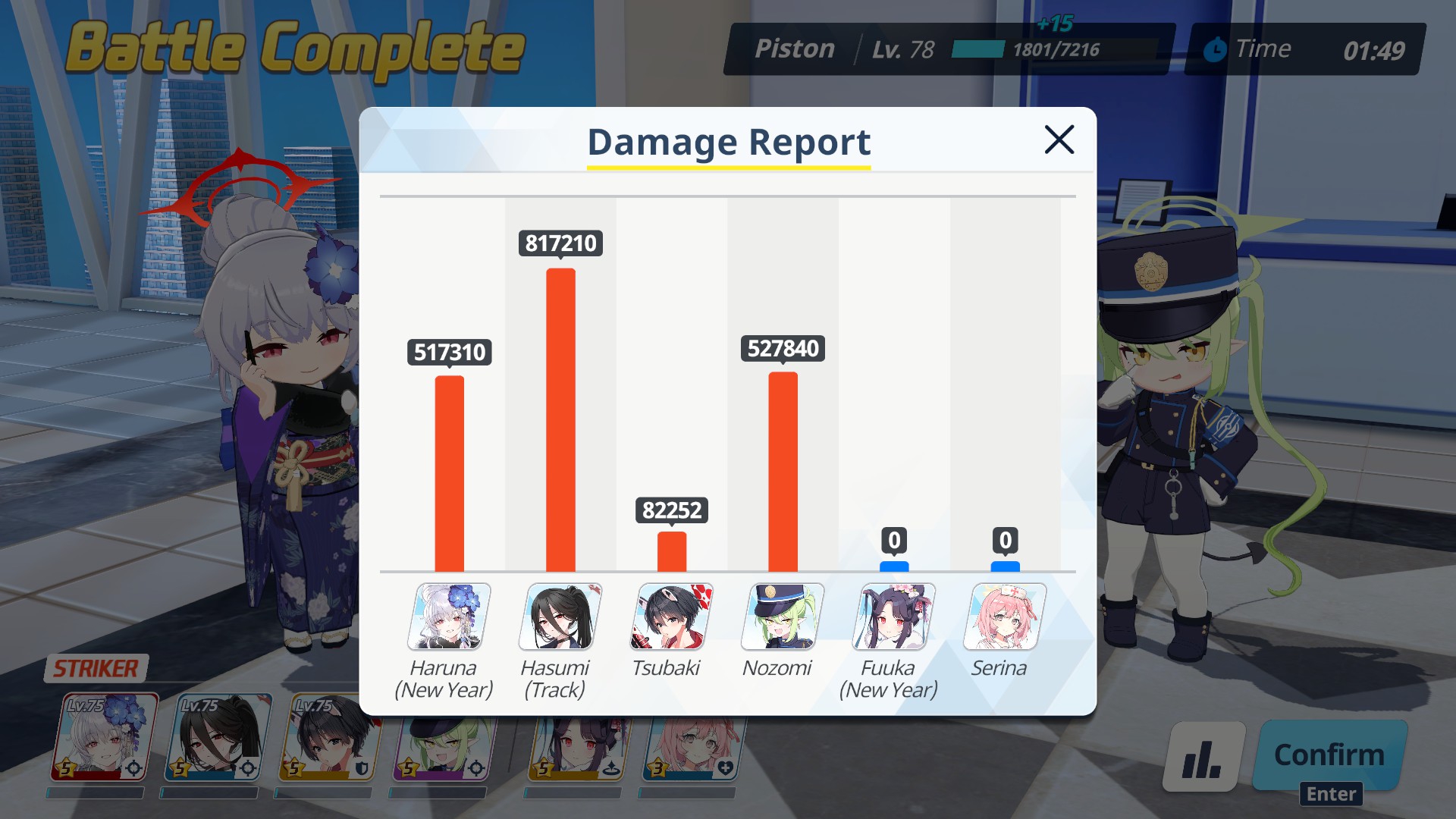 И говорю что если запустить бой ручками без галки автобоя и уже в бою включить автопрожатие скиллов, то победа будет без потерь в хп практически. Ведь ханако всё сдувает одной кнопкой, а студентки получают урон в районе нуля.