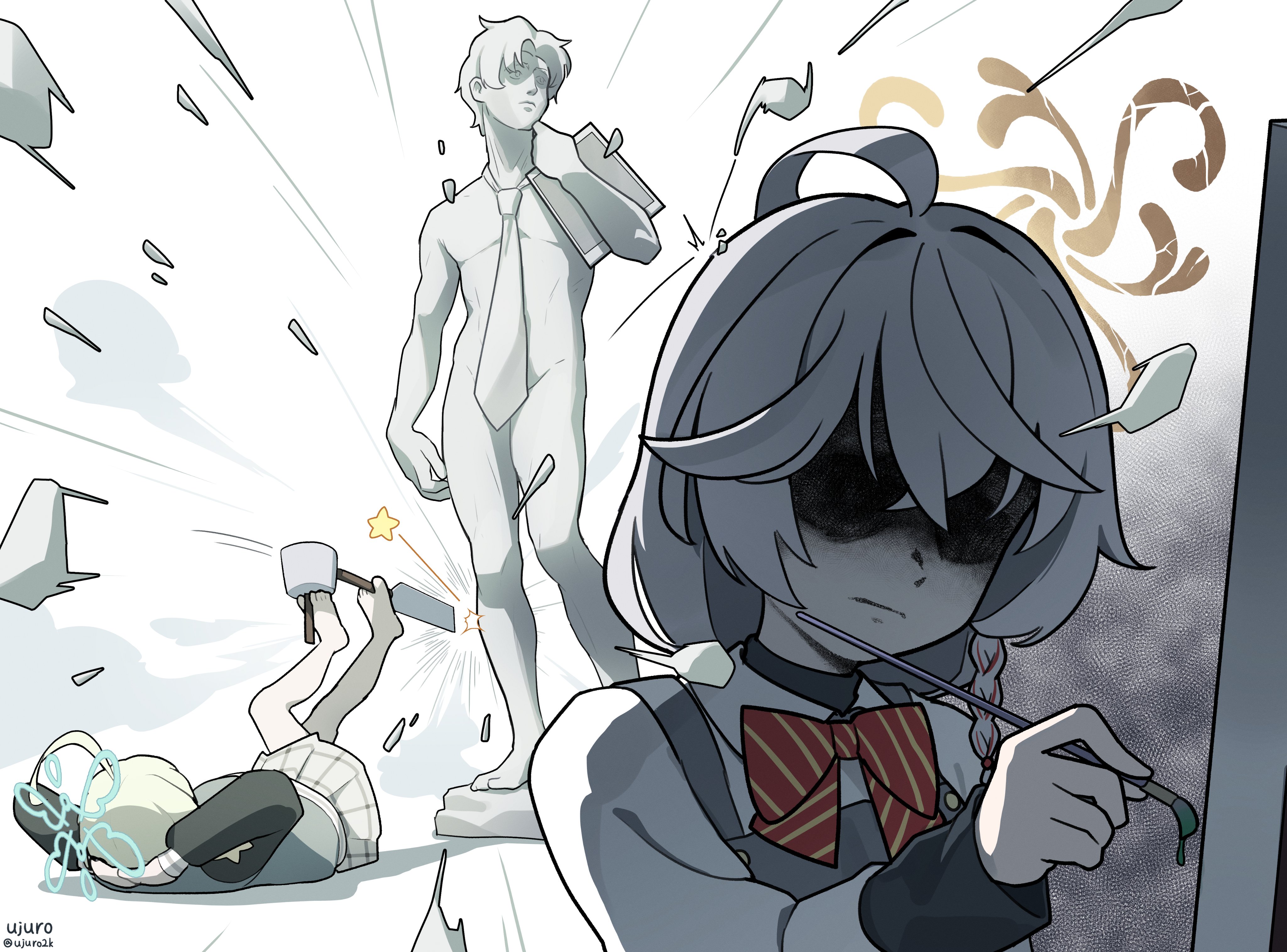 МИЛЛЕНИУМ, КЛУБ РАЗРАБОТКИ ИГР. Врываюсь с ноги, вышибая дверь. Момои и Мидори сидят на пуфиках и рубятся в файтинг. НЕТ ВРЕМЕНИ ОБЪЯСНЯТЬ! Хватаю Момои и Мидори и сталкиваю их лбами под звук "K.O.!" из их же игры, и пока они в отключке, быстро делаю два фрага. Юзу забилась в свой шкафчик. СУКА, ДУМАЕШЬ, СПРЯТАЛАСЬ? Выламываю дверь, вытряхиваю её оттуда, и быстро продуваю, вдуваю как старый пыльный картридж из Денди. Остается Арис. Она смотрит на меня своими невинными глазами и спрашивает: "Это… ивент?" — "ЭТО ПАТЧ БЛЯДЬ", — отвечаю я и начинаю действовать. Слышны только звуки "пиу-пиу", но это она от неожиданности нажимает на кнопки геймпада. Обновлено. Дальше.