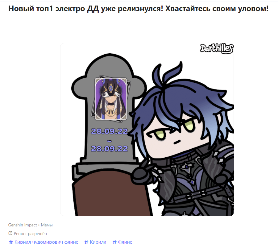 Лол, как же у хуелабовцев подгорело с того стикера с Флинсом и Сайно. Побежали в комменты кидать карточки со своими элеткро дд без Флинса. Я думал что шутки про людей которые бомбят, когда их мид тир персонажа называют мид тиром это всего лишь шутки, но видимо нет. Да ладно, на самом деле эти комменты это ирония. Так ведь? Вайфугеймеры, да?