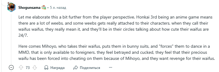 >>5670650 > Позвольте мне немного подробнее рассказать об этом с точки зрения игрока. Honkai 3rd — аниме-игра, а это значит, что в ней много вайфу, и некоторые из них очень привязываются к своим персонажам. Когда они называют своих вайфу вайфу, они действительно это имеют в виду, и в своих кругах они будут говорить о том, какие они милые 24/7.