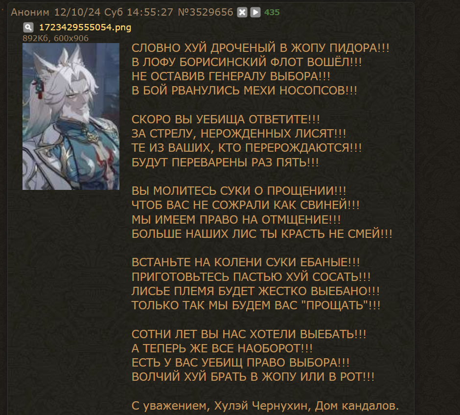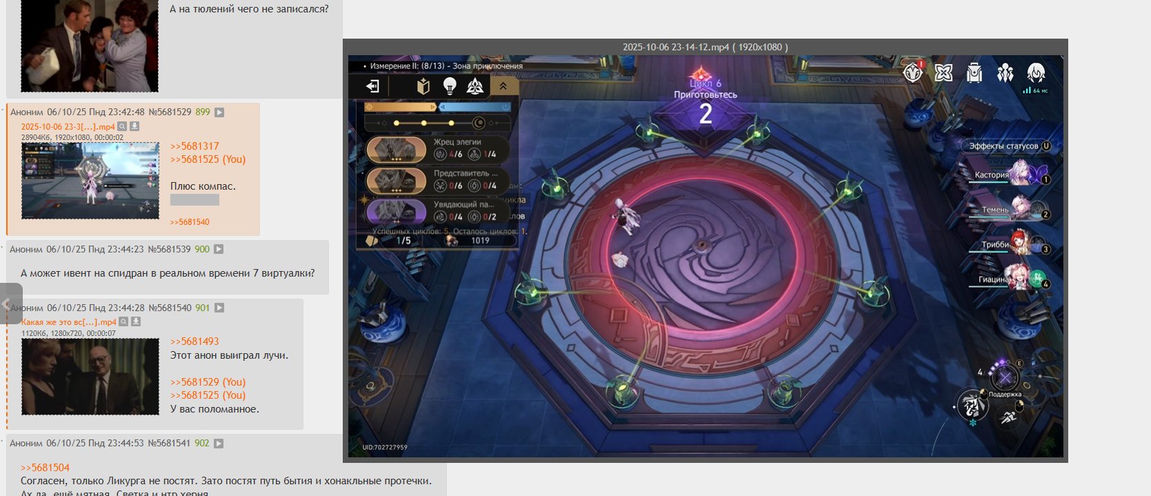 Настроения там такие. Много постинга по поводу того, насколько Амфореус кал или не кал. Много постинга и мемов с Тьмарт, очень уважаемый у них персонаж, похоже. Ещё очень любят Цифер и часто называют её в треде словом kot (не шучу). Над киренофагами и гертофагами угорают, частота пискропостинга примерно как у нас. Гораздо больше ликургопостинга, чем у нас, странно! И такое ощущение, что тред периодически пытаются вайпать ИИ-слопом. В общем и целом -- дрянь, а не тред, у нас в миллион раз интереснее.