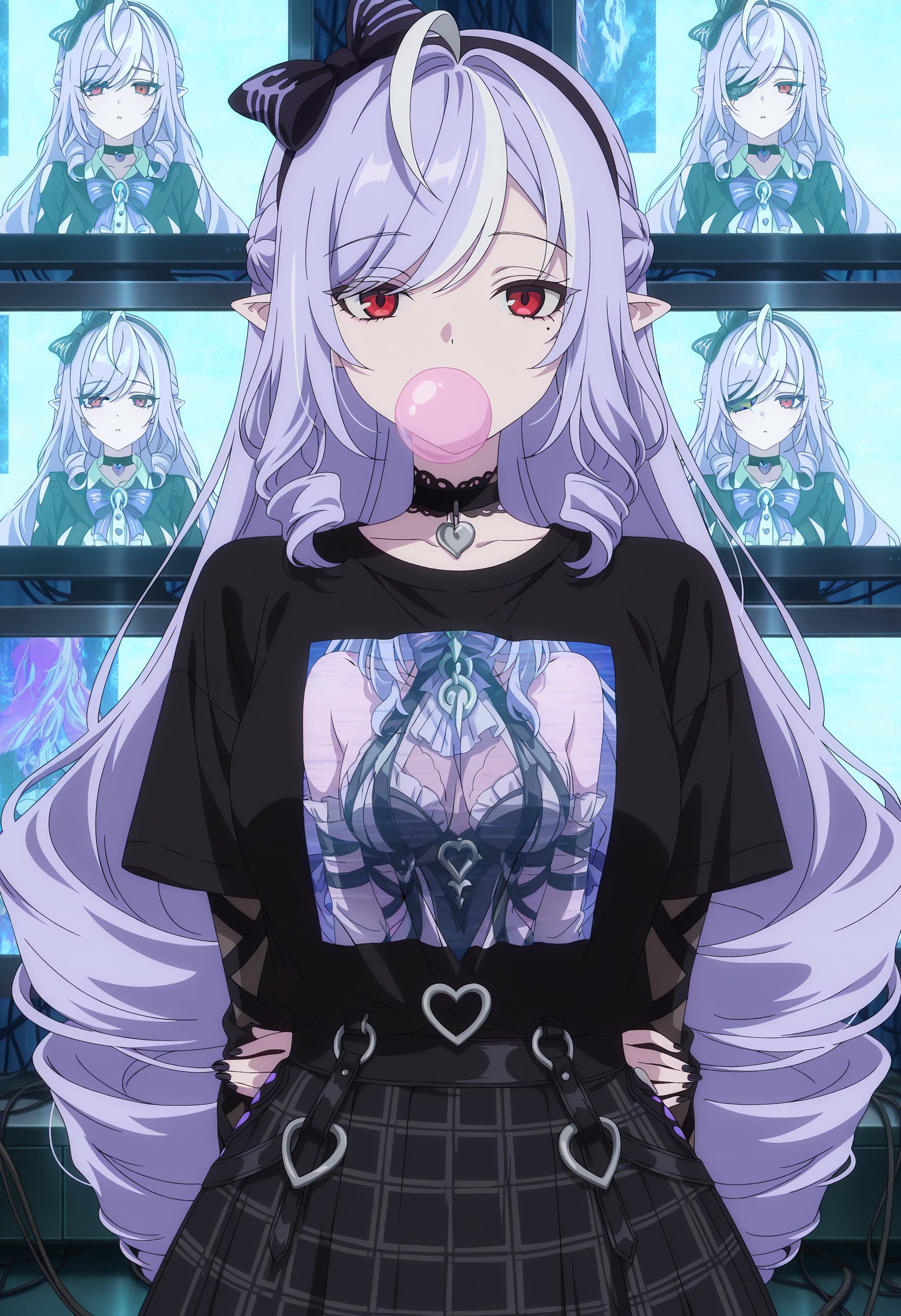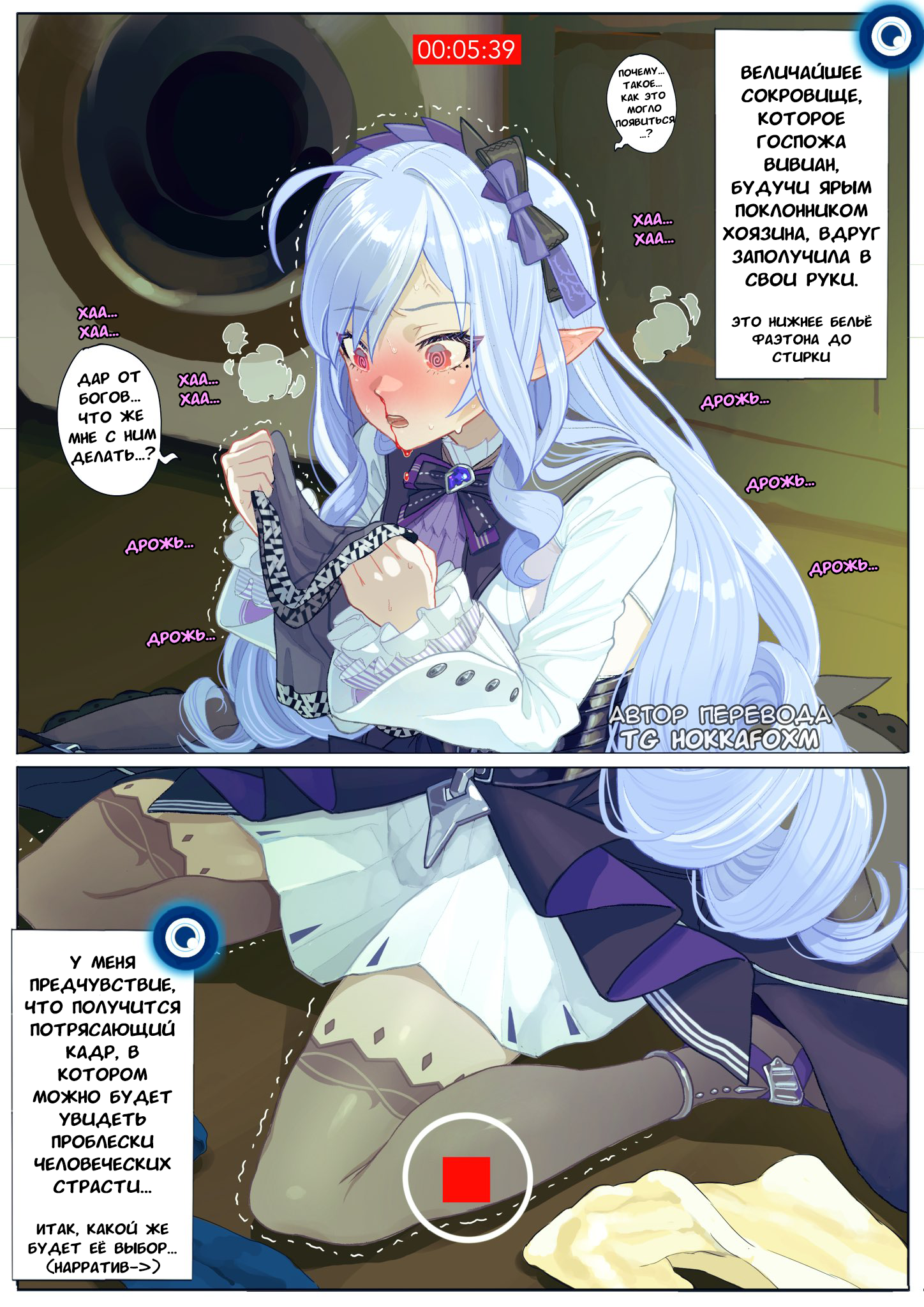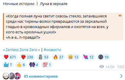 «Когда полная луна светит сквозь стекло, затаившиеся среди нас тирены-волки превращаются за зеркальной гладью в кровожадных эфириалов и охотятся на всех, у кого есть кроличьи ушки!» «А-а-а.. п-правда?!»