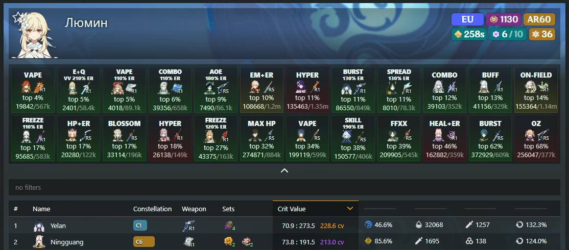 >>5686572 Лунный тазик задействует АТК, немного ЕМ и криты. Кирюхе надо АТК/АТК/криты собирать. Лунная бутонизация задействует только ЕМ и криты. Нефер надо ЕМ/ЕМ/криты собирать.