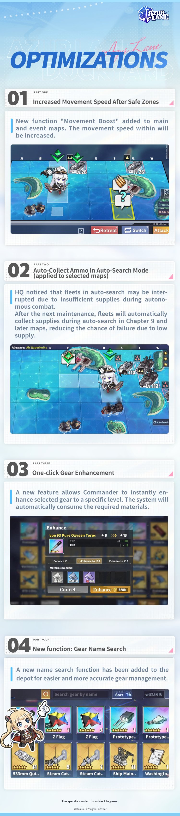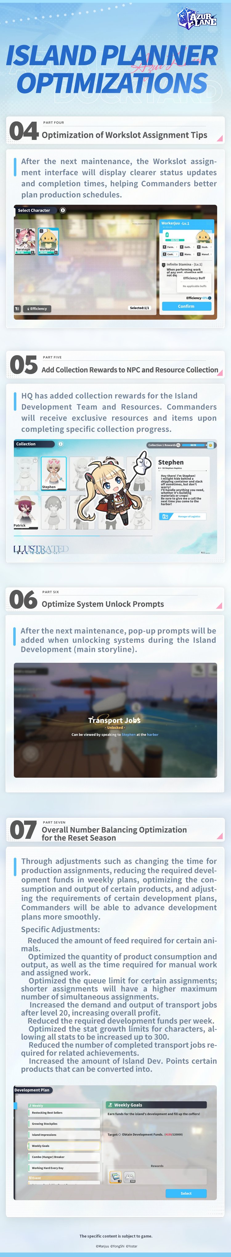 >>5728121 System Optimization Optimized the performance of the reconnection feature; Improved the display of remaining sale time for special furniture in Private Quarters under certain conditions; Enhanced the display of locked character avatars in Private Quarters; Added a tights on/off interaction feature in Private Quarters; Introduced a Transport Jobs refresh function in Island Planner; Optimized item detail displays in certain interfaces of Island Planner; Fixed an issue where the Island Technology Café Manjuu Slot B was abnormally unlocked; already produced items will be automatically claimed after this maintenance; Adjusted prices of fruit tree seeds in the Island Planner store: Apple Tree Seeds: 100 Citrus Fruit Tree Seeds: 120 Banana Tree Seed: 140 Mango Tree Seeds: 180 Lemon Tree Seed: 80 Avocado Tree Seeds: 240 Rubber Tree Seeds: 280 Yoizuki Pear Seeds: 120 Kaki Persimmon Seeds: 180 ※Commanders who purchased these items at the original prices before the adjustment will receive compensation for the price difference after the maintenance on October 16. Fixed an issue where Workerjuus in Island Planner were not displayed correctly under certain conditions; Fixed an issue where daily and weekly plans in Island Planner failed to refresh properly under specific circumstances; Fixed an issue where items on certain screens would not display correctly in some cases; Fixed an issue where character interactions could not be executed properly under certain conditions; Fixed an issue where some character data failed to display correctly in specific scenarios; Fixed some UI, texts, and images.