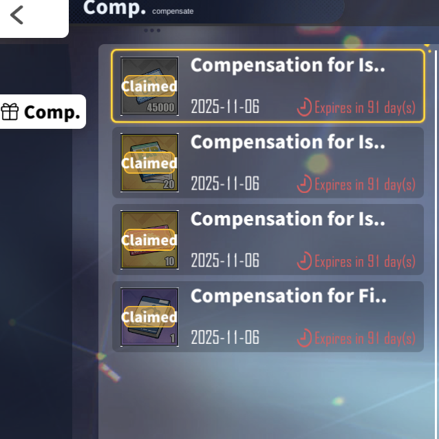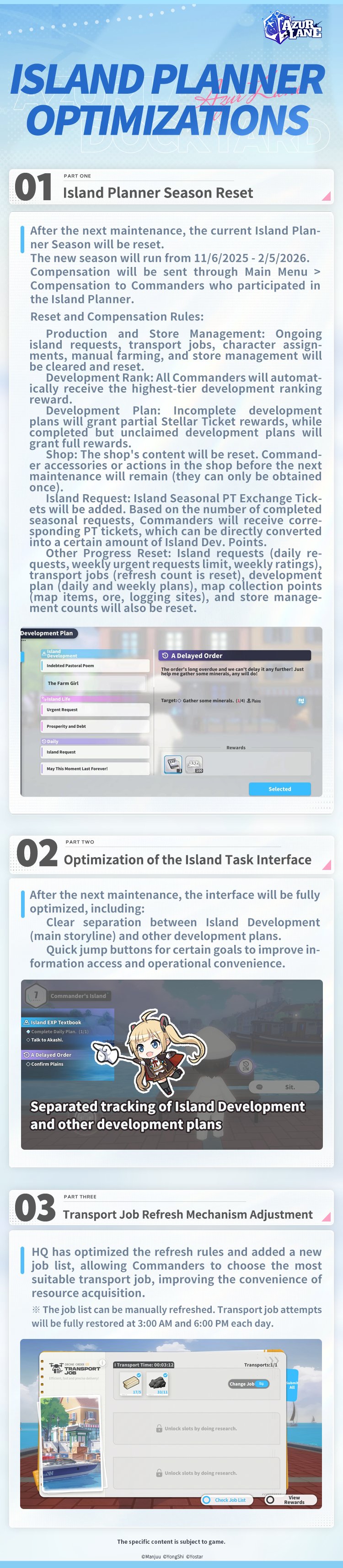 In 11/6 maintenance, resources in the warehouse will be automatically converted to Island Dev. Points, and then the total Island Dev. Points will be calculated. *As the season ended early, for this special reset, after all resources have been converted, the total Island Dev. Points will be converted x4 into Final Island Dev. Points. Accumulated Island Dev. Points rewards will be sent based on this Final Island Dev. Points. Note: Autumn's seasonal resources will not be converted. What will NOT be reset after the special reset: All permanent/one-time only content, including Dev. Funds, Island Dev. Level, character-related content (acquisition, stats, growth-related items), Get-Together Island content (buildings and furniture), outfits and accessories (for characters and Commander), Island Tech, Store Rank, Island Planner main and side story progress, Achievements. Stellar Prize Draw status, including Prizes, obtained rewards, draws remaining, accumulative rewards, and Stellar Tickets Autumn specialties and resources, seasonal requests, and event plan progress