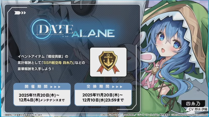 New Events Available for a limited-time between 12/4/2025 – 2/2/2026, 11:59 P.M. (UTC-7) Popularity Poll 2025 (Complete event missions to collect ballots and use them to vote for your favorite shipgirls and receive rewards based on how many votes you have cast.) ※The Popularity Poll 2025 will have two types of votes: the regular Main Votes (7 rounds including Qualifiers, Group A-D, Repechage, Finals) and the Special Votes (3 rounds including Special Votes I-III). ※All Commanders who have reached Commander Level 25 are able to obtain Main Vote ballots by completing daily missions and one-time missions and obtain Special Votes ballots by logging daily. ※Excluding shipgirls already in the Hall of Fame (Amagi, Laffey, Bismarck, New Jersey, Prinz Eugen, Friedrich der Große, Shinano, Ägir, Kearsarge), all shipgirls available in the game before November 23rd, 2025 are eligible to participate. Collaboration characters (excluding blueprint ships), µ-rigging, Type II rigging, as well as alternate versions of shipgirls cannot participate in the poll, but META and Little shipgirls can be voted on in the special vote rounds. ※Characters that are newly added to the Hall of Fame will receive new stories and limited portrait frames. The commemorative furniture will be available between 2/3/2026 – 2/7/2026, 11:59 P.M. (UTC-7) after the Popularity Poll 2025 ends.