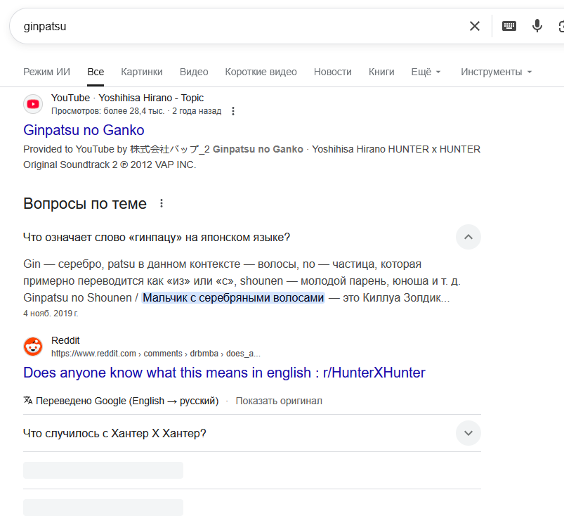 >>5922073 >а гугл не совсем подходящие ответы дает >In Japanese, "ginpatsu" (ぎんぱつ or 銀髪) means "silver hair" or "gray hair". It is a compound word where "gin" (銀) means "silver" and "patsu" (髪) means "hair". The similar-sounding word "kinpatsu" (きんぱつ or 金髪) refers to "blonde hair".
