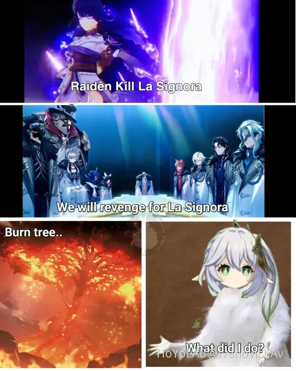 Тянки Змеюка залупнулась на Инадзуму, Дыня порубили её на суши Мявуика спасла свой народ от бездны Фурина 500 лет мастерски играла роль что бы спасти свой народ Тупые Учёные вместо того что бы отправить Нахиду учиться и набираться знаний просто заперли её в клетке.