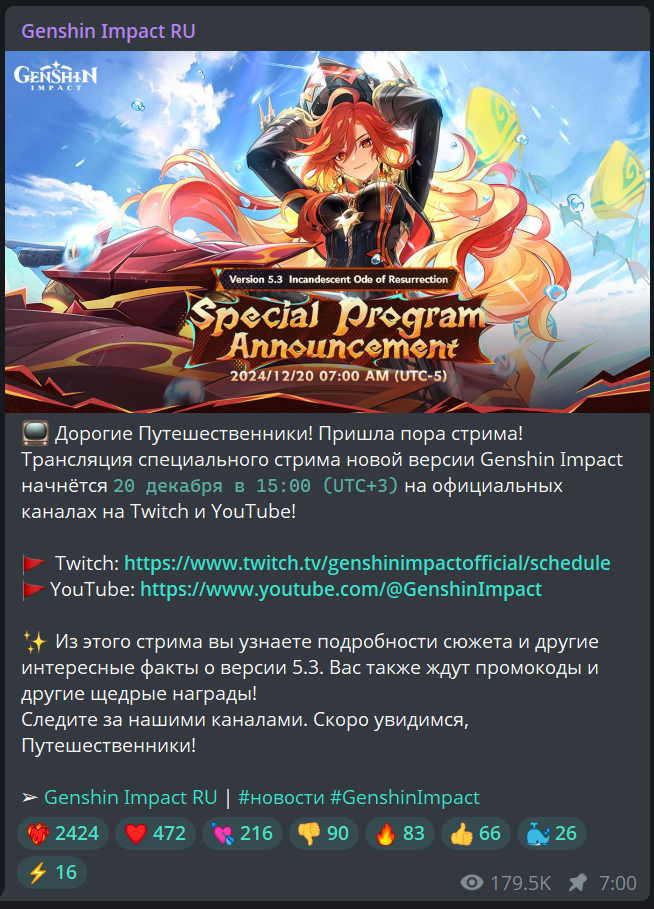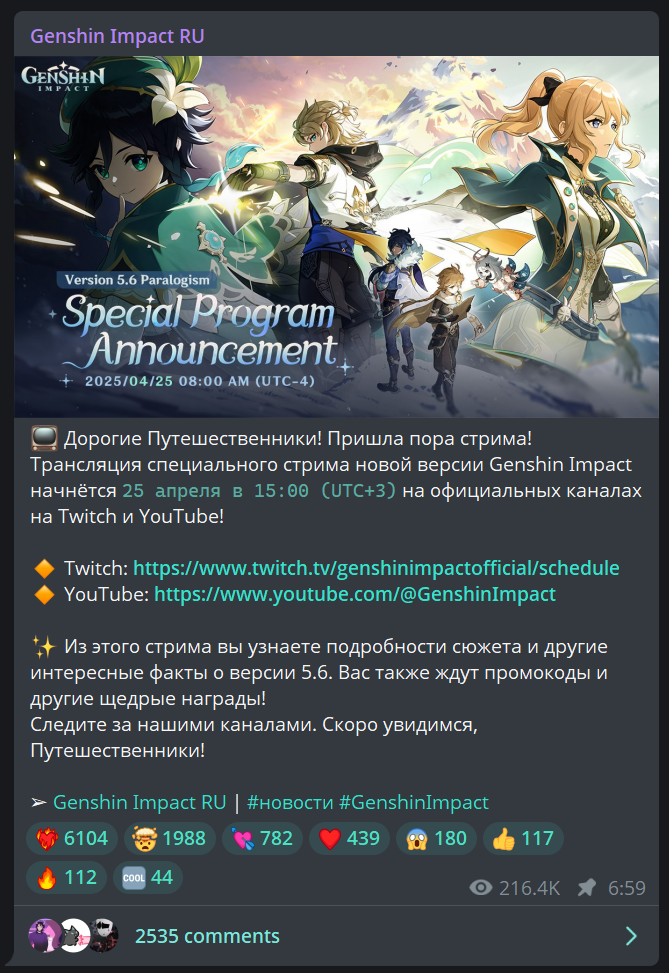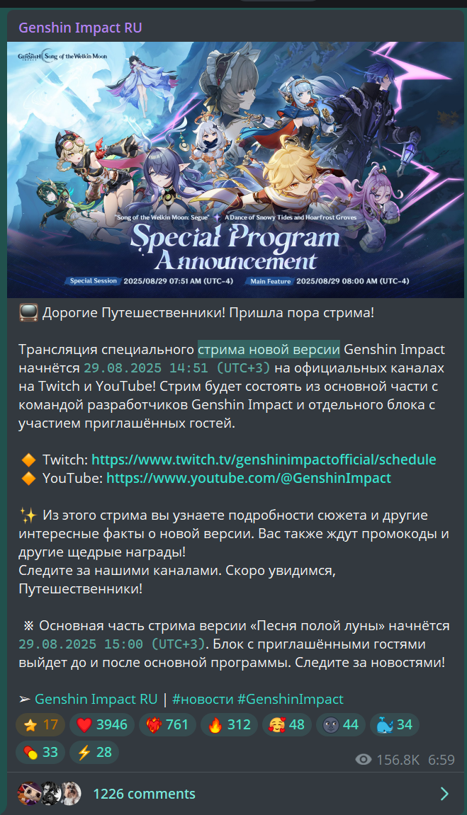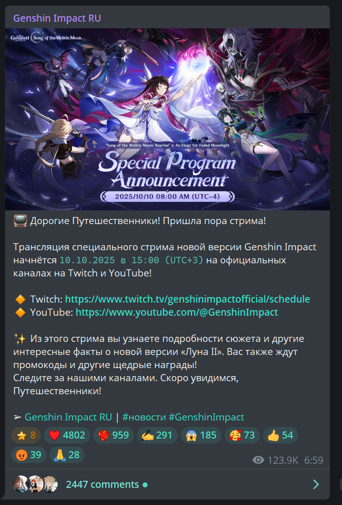 📺 Дорогие Путешественники! Пришла пора стрима! Трансляция специального стрима новой версии Genshin Impact начнётся 10.10.2025 в 15:00 (UTC+3) на официальных каналах на Twitch и YouTube!